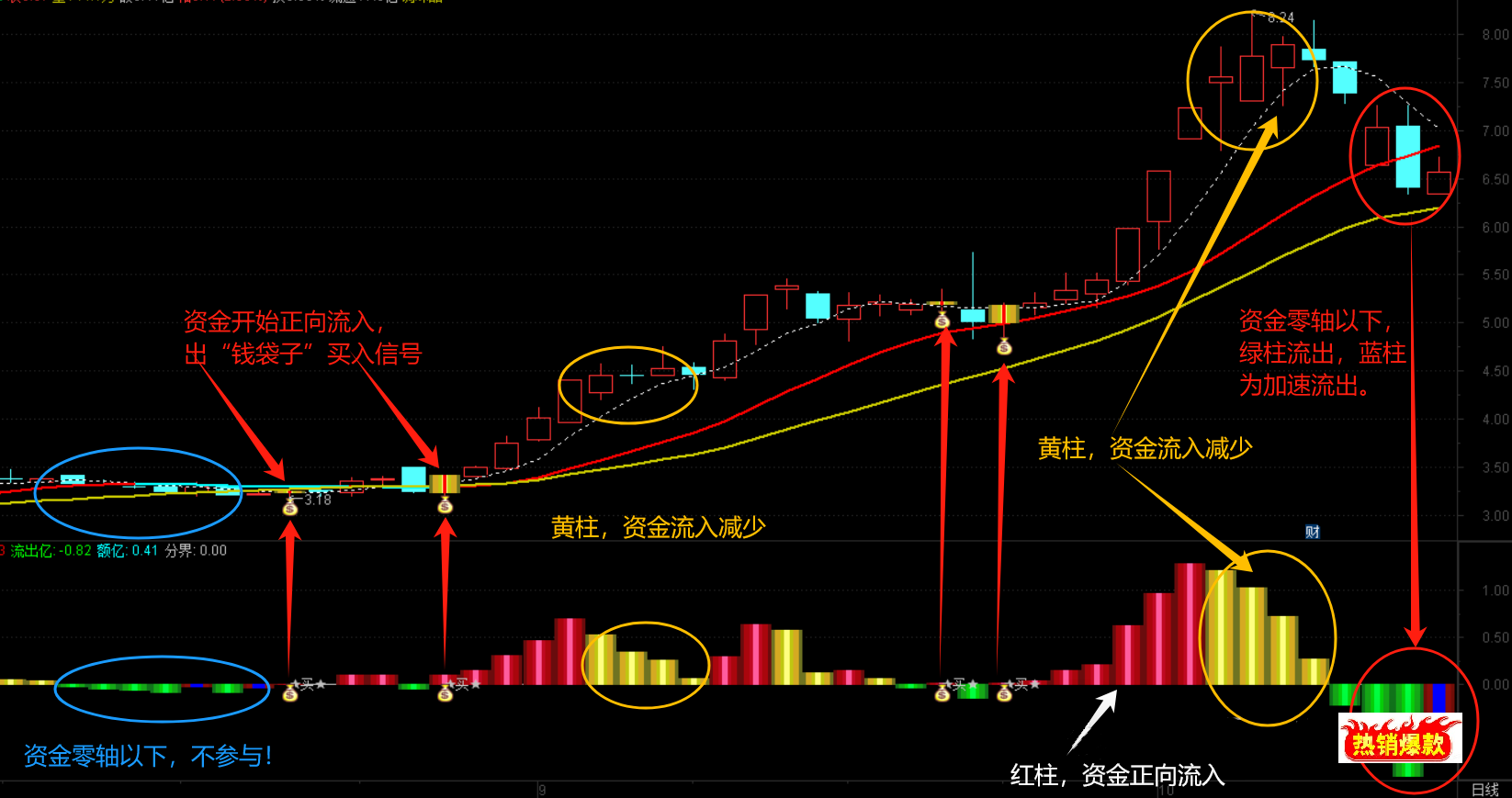1、当资金开始正向流入时,出“钱袋子”买入的信号,此时副图指标出现红柱向上的信号,可开始重点关注;