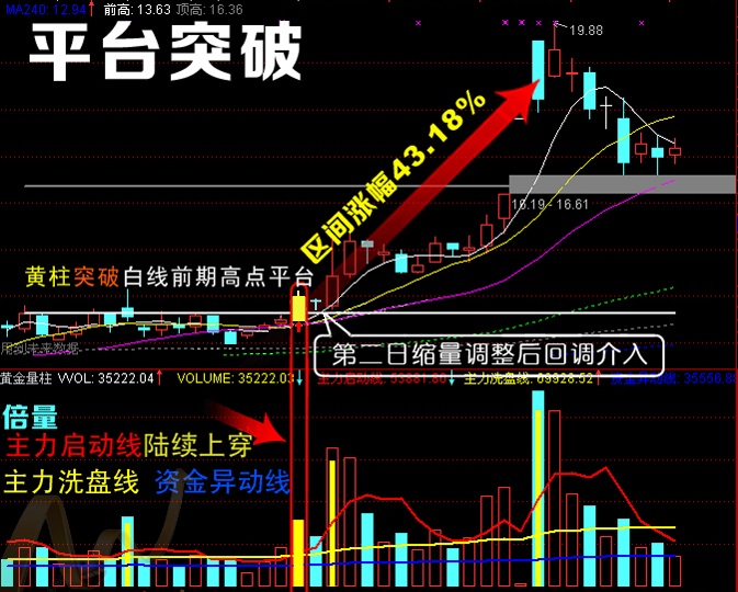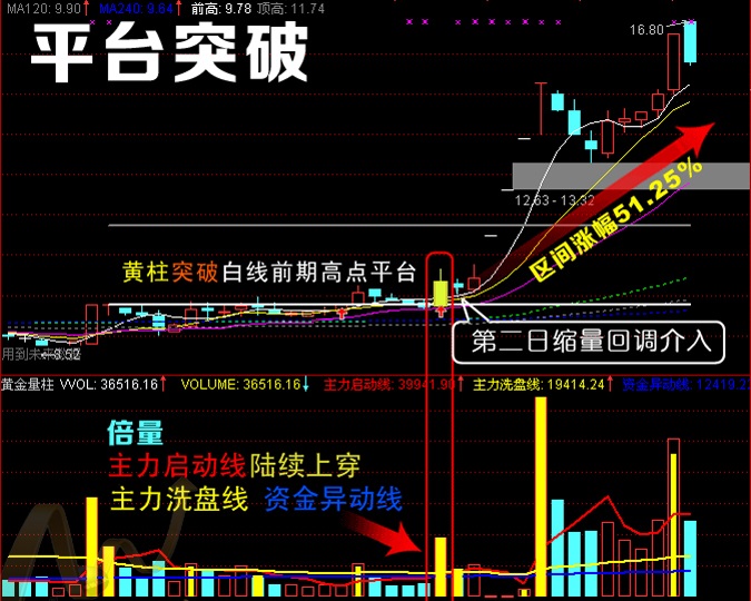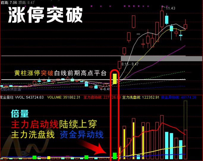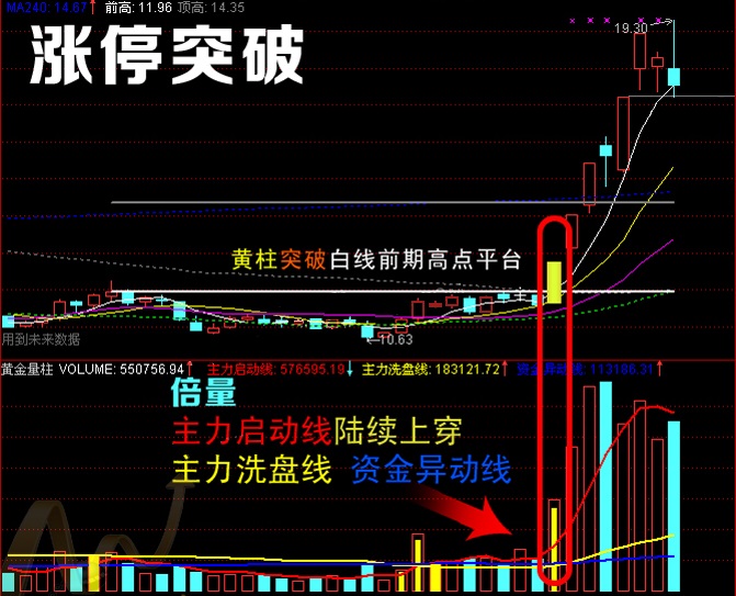 定义:当主力启动线上穿资金异动线,或者主力洗盘线高于资金异动线并且主力启动线上穿主力洗盘线,并且收盘价高于开盘价时,在0和成交量位置之间绘制宽度为3的柱状线。