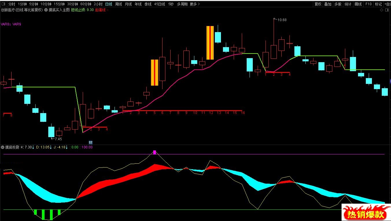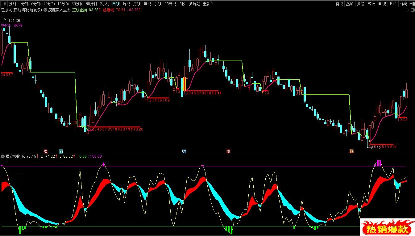 1、黄线上穿底部绿色横线,趋势缓解。等出现红色色带,说明趋势来临,重点关注。当主图股价踏上止损位或主图出现数字即可买进。