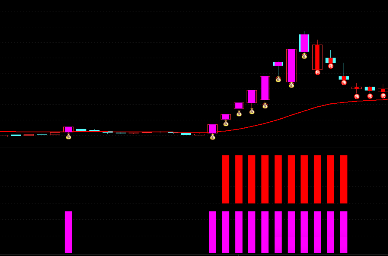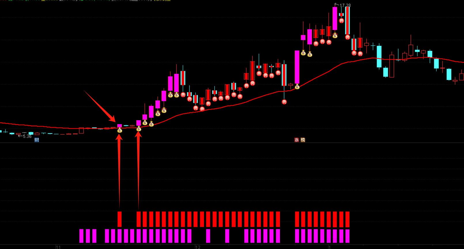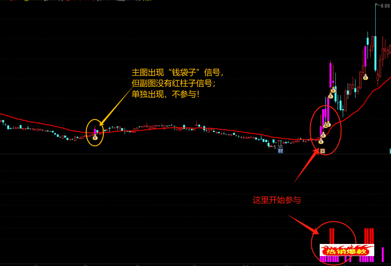 3、若只有主图单独出现钱袋子信号,但副图没有出现红柱子,不参与!