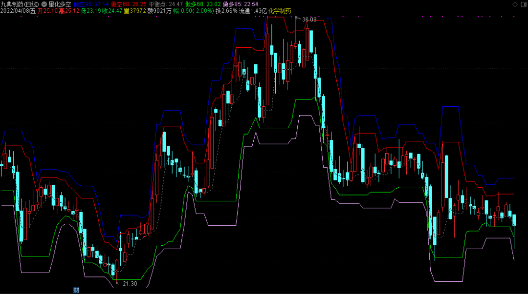 2️⃣ 构成与作用:红线表示做空概率为68%,当股价到达红线时,操作上将冒2元钱的风险赚1元钱的利润,风险收益比为2:1。紫线表示做多概率为95%。