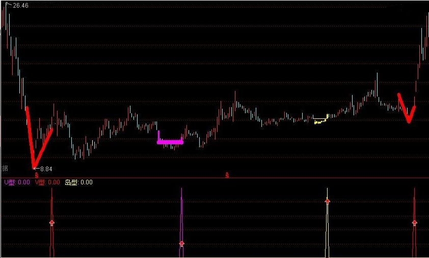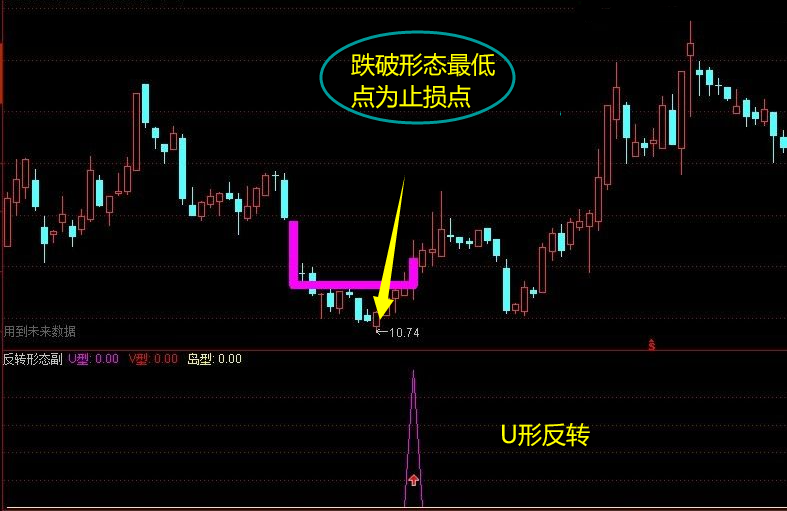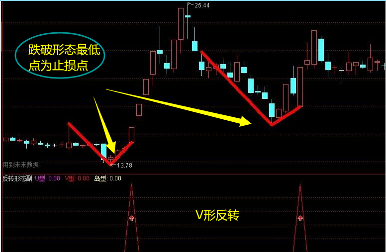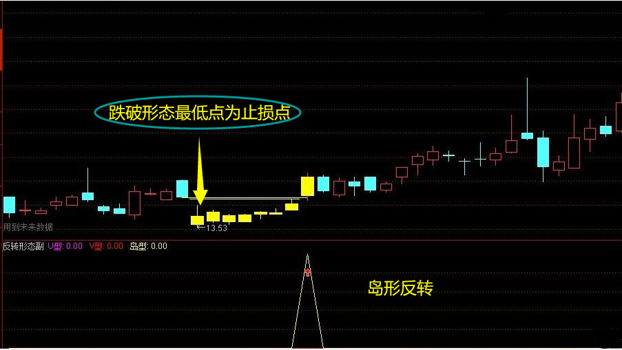 是根据三个不同的反转形态(分别是V型反转,U型反转和岛形反转)组合在一个指标里,更加方便看图 跌破形态最低点为止损点
