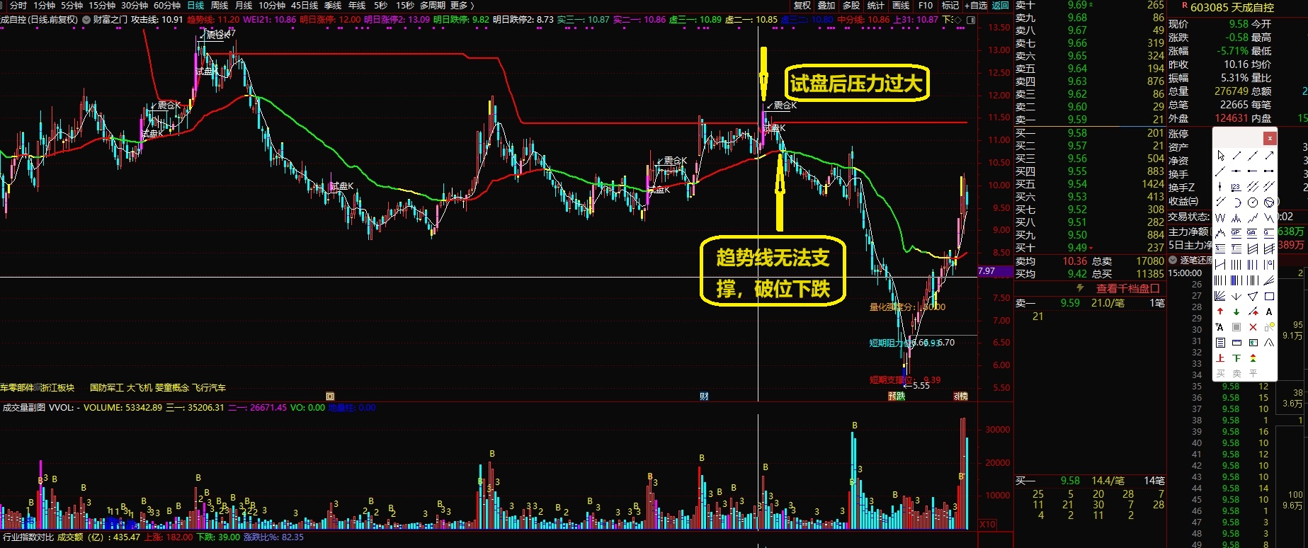 特别注意:检测会出现未来函数,是因为公式中设置了仅对K线粉色和黄色颜色变化,试盘K线、趋势线等颜色不会变,未来函数无影响,指标信号不漂移,不喜勿喷,不是所有的未来函数都是有坏处的,合理使用未来函数对我们判断整个票的运动规律起到了很大作用。