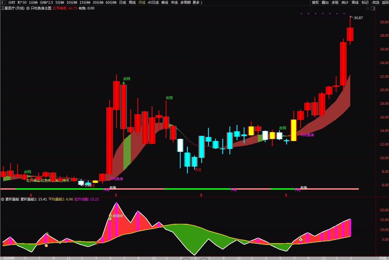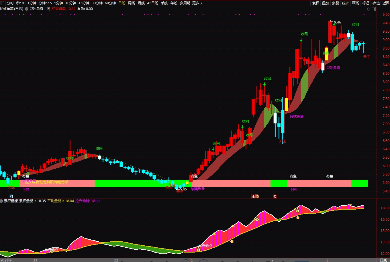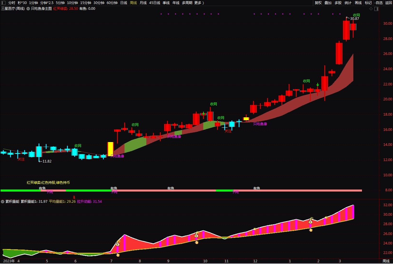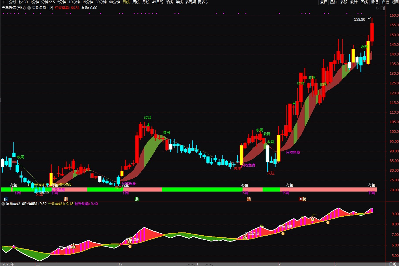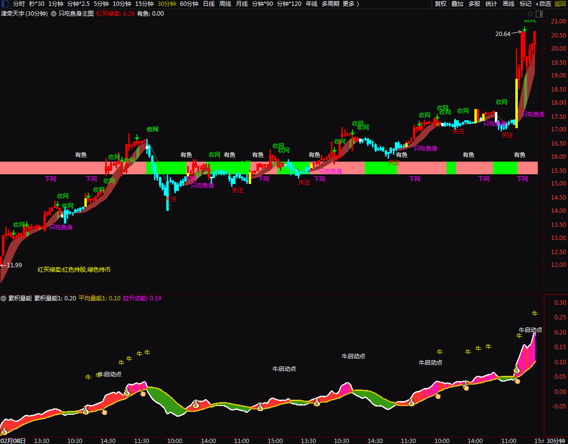 只吃鱼身主图+选股公式+累积量能副图。指标可用于全球股票,期货,可转债交易。