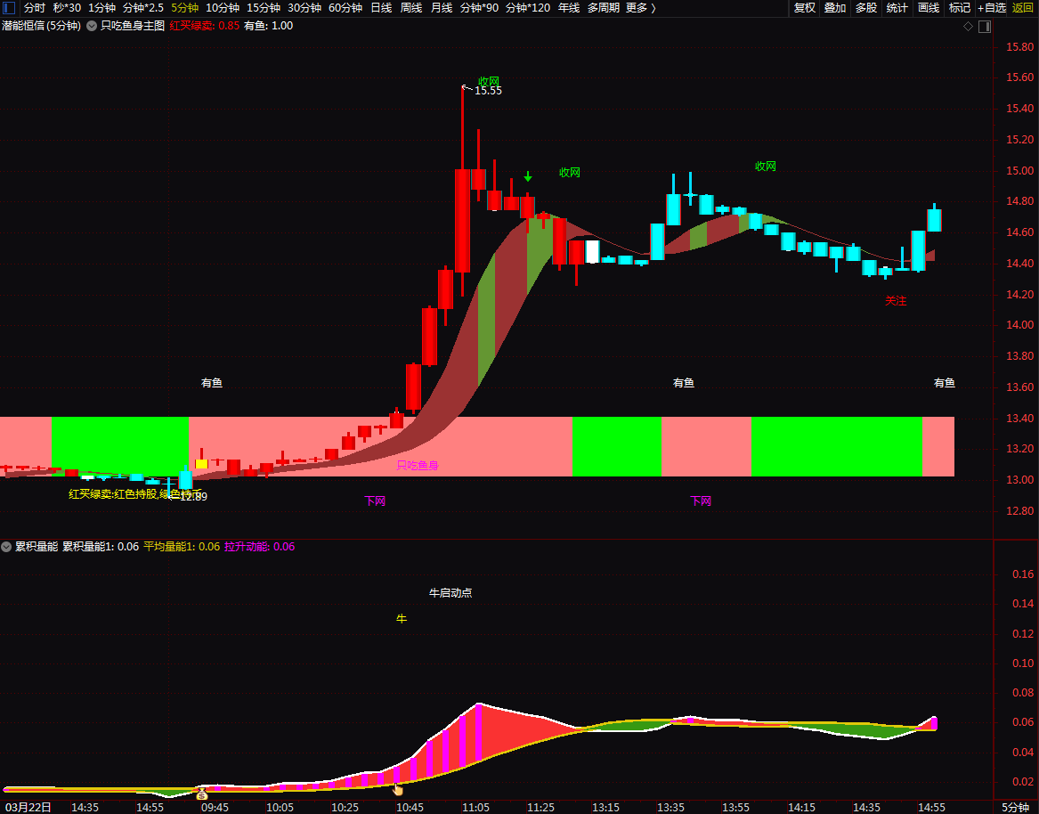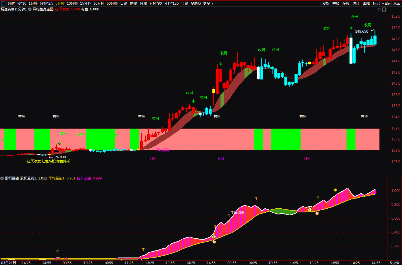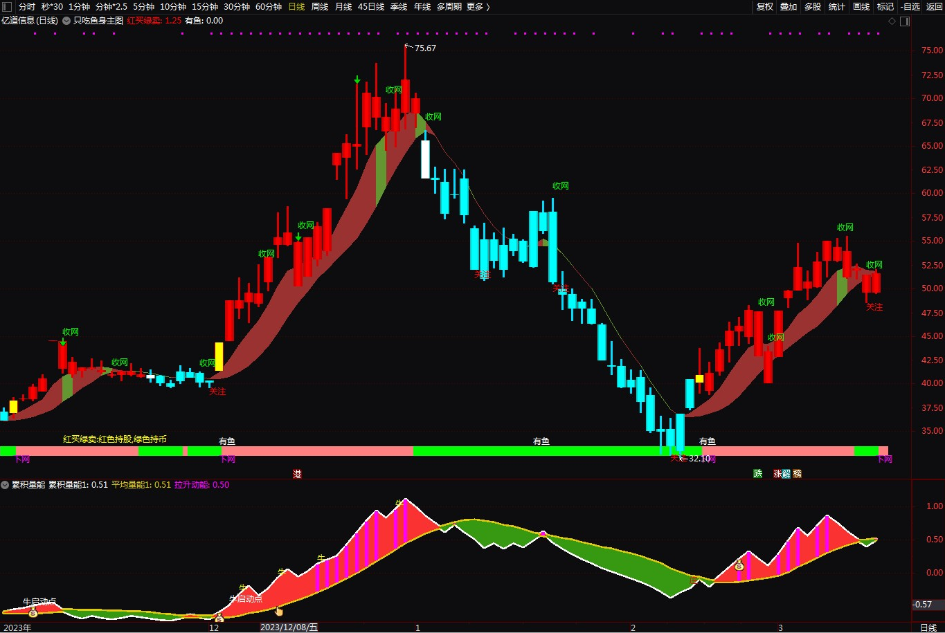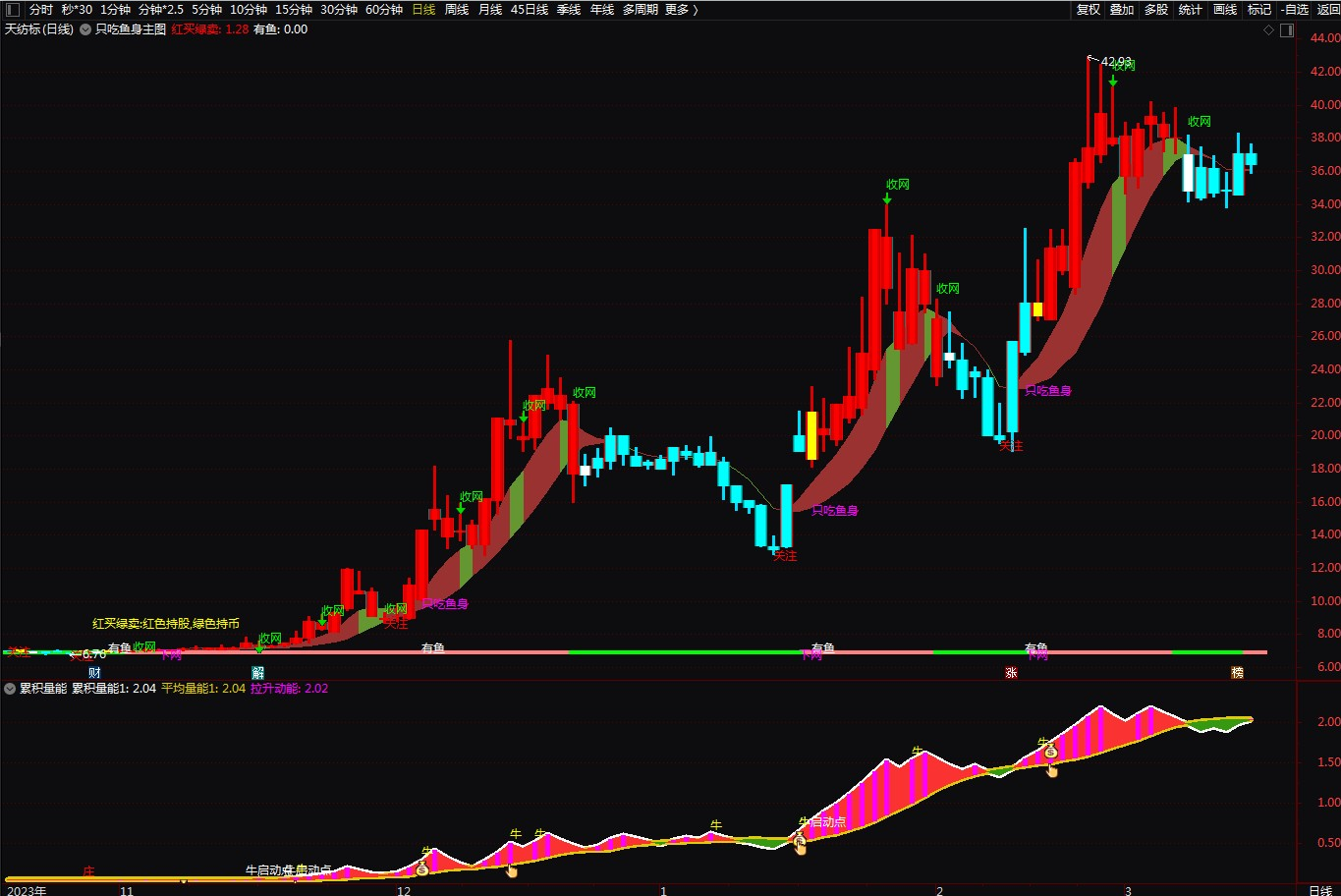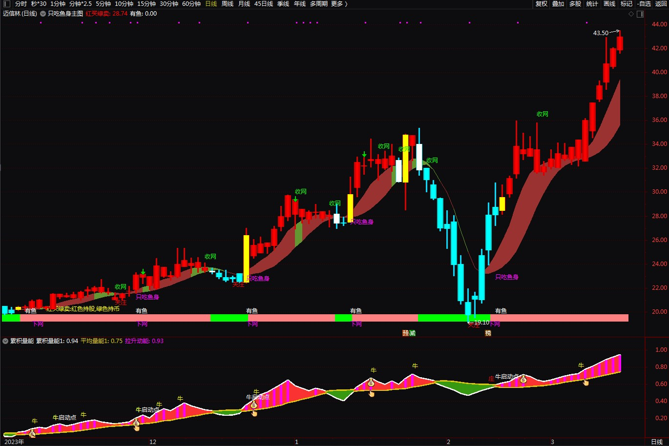 只吃鱼身主图+选股公式+累积量能副图。指标可用于全球股票,期货,可转债交易。