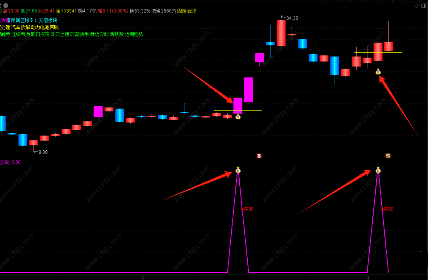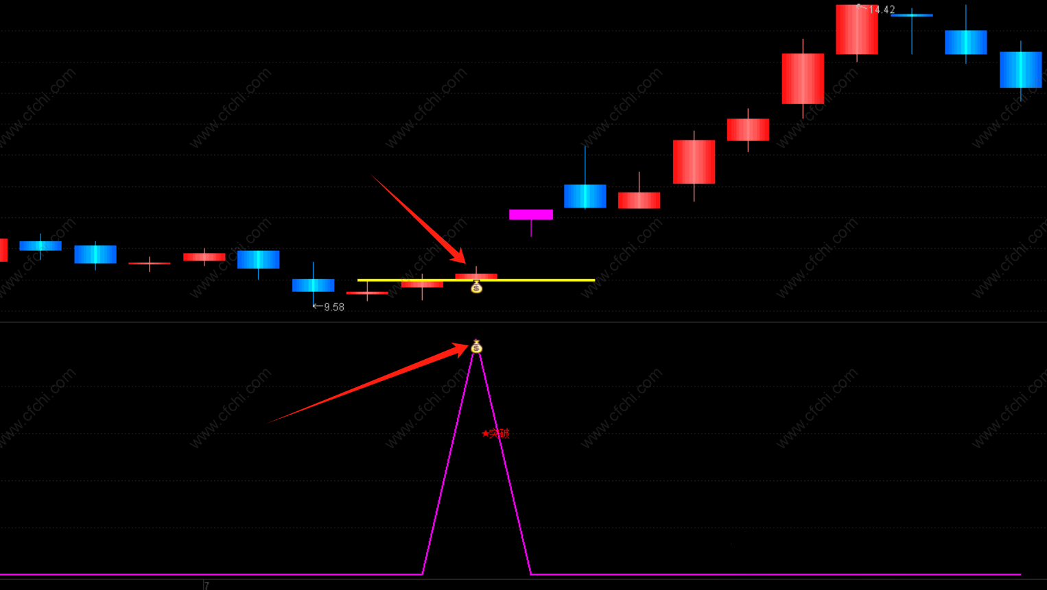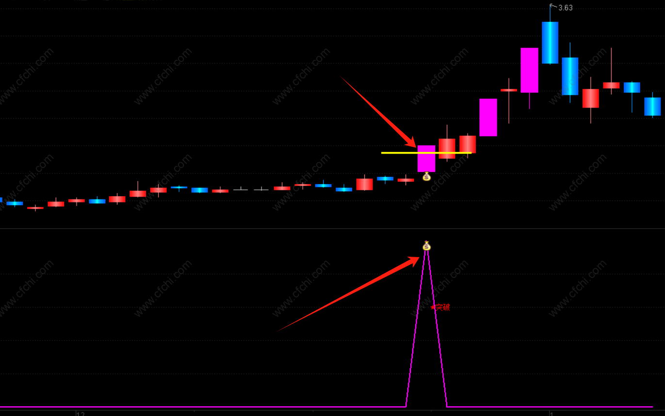 当股价突破筹码获利比例大于85%、筹码集中度小于20的条件时,显示“钱袋子”信号,做了一根黄色的横线,用于突破标识。