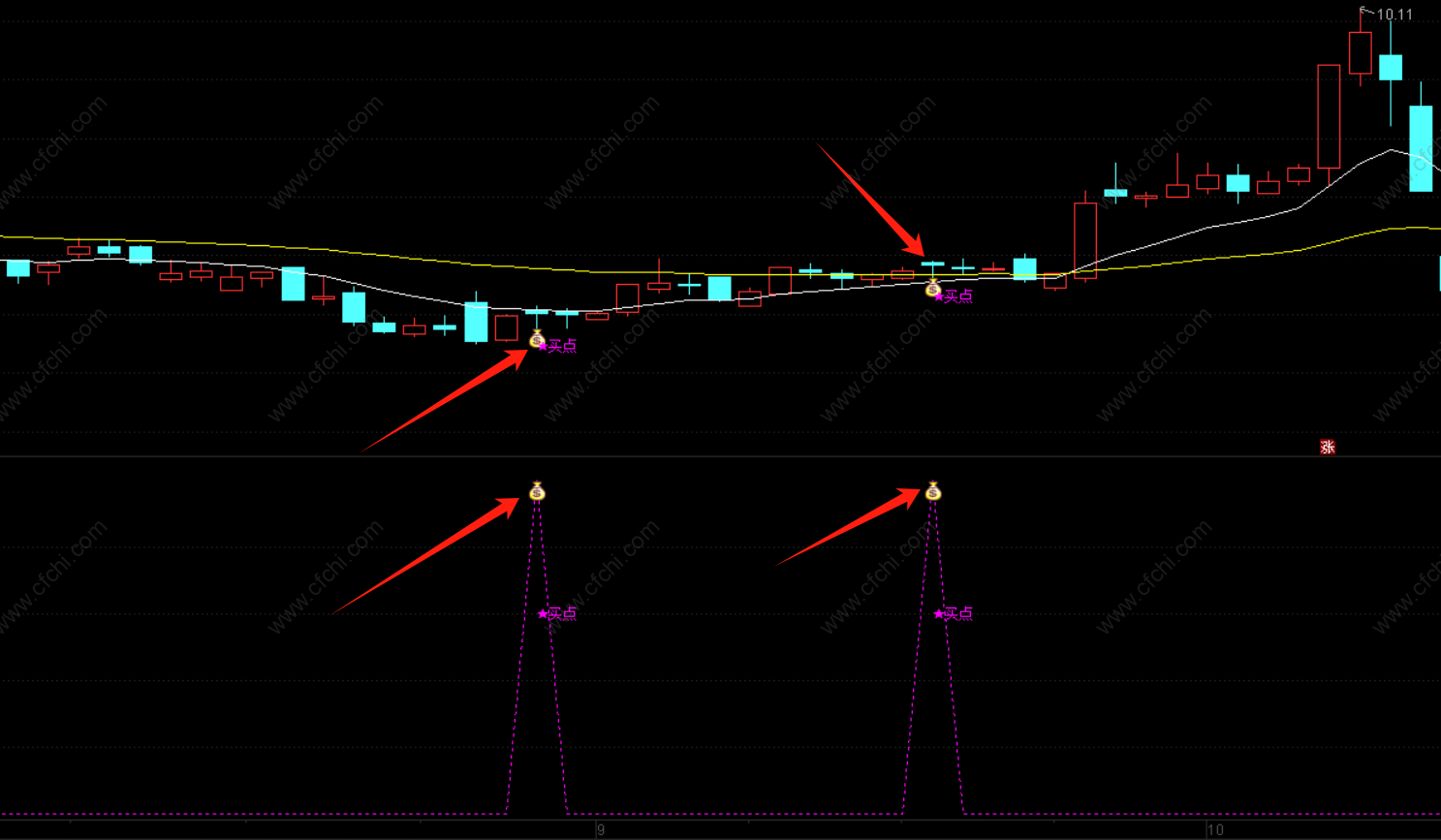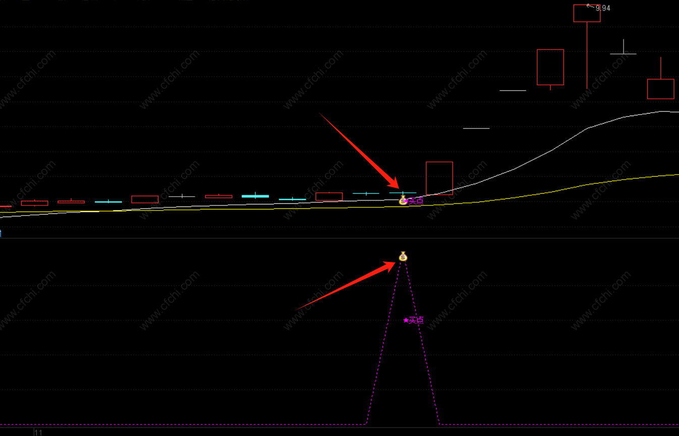 阴线上出现的“钱袋子”买点信号,可盘中或盘后选股参考;
