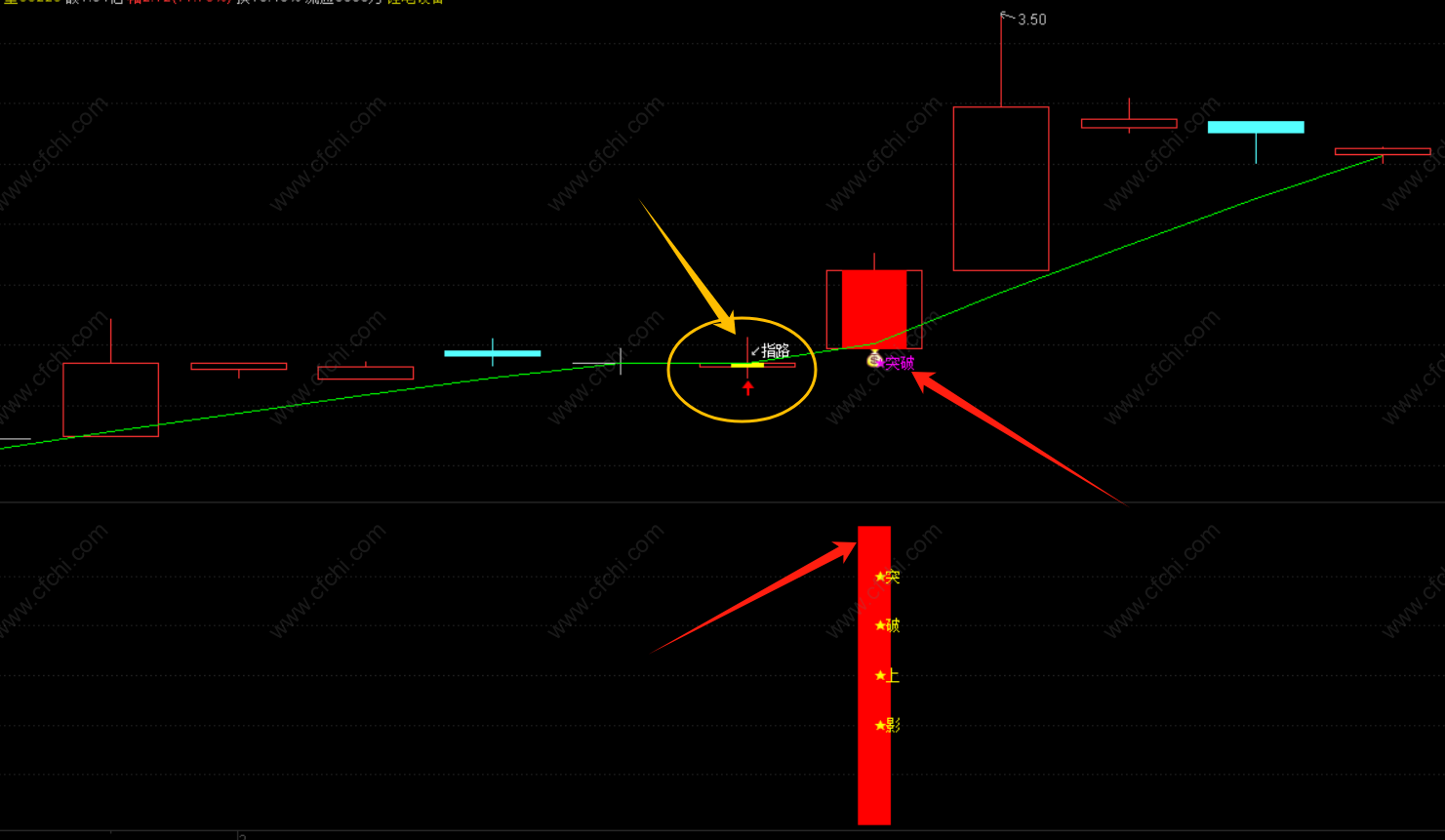 突破前一天红箭头“上影线”,第二天突破后出现“钱袋子”的买入信号。