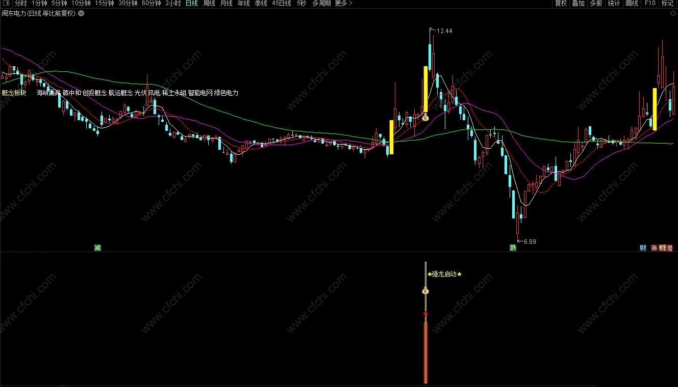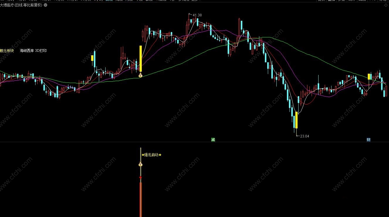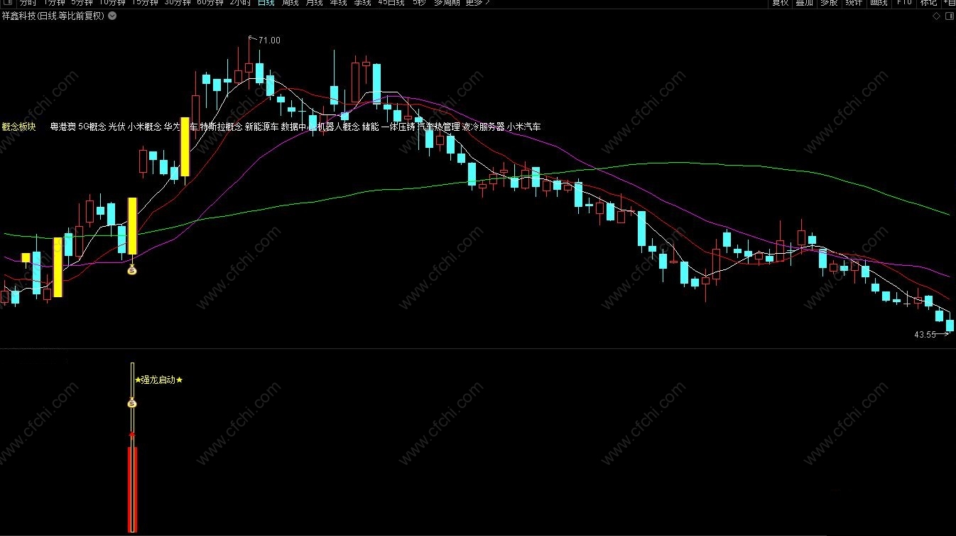 强龙主图指标在涨停强势显示黄柱,在强势后起始钱袋子为强龙渡江信号,副图做了启动的信号提示,可在盘中设置预警选股,此套指标支持手机电脑。