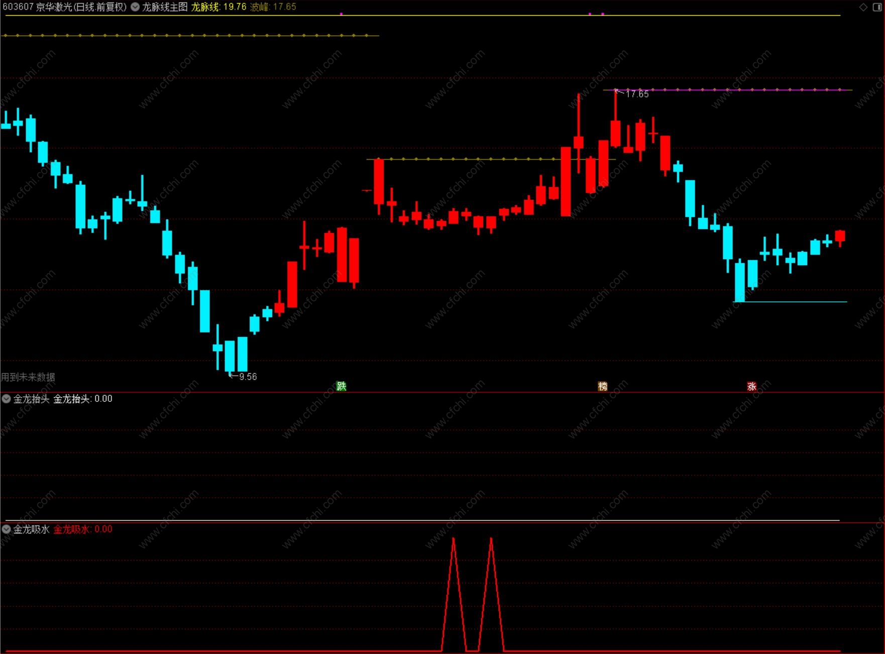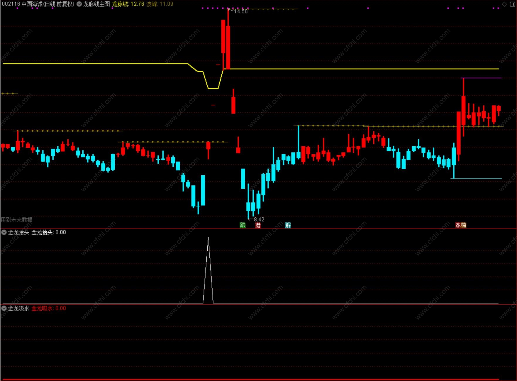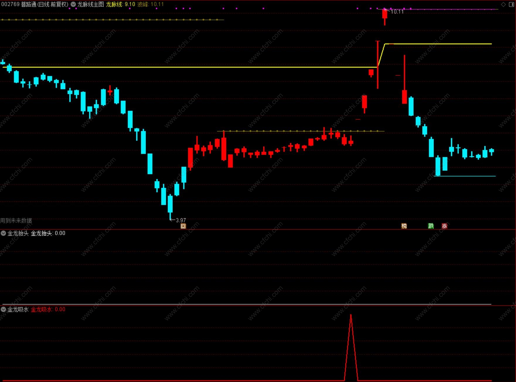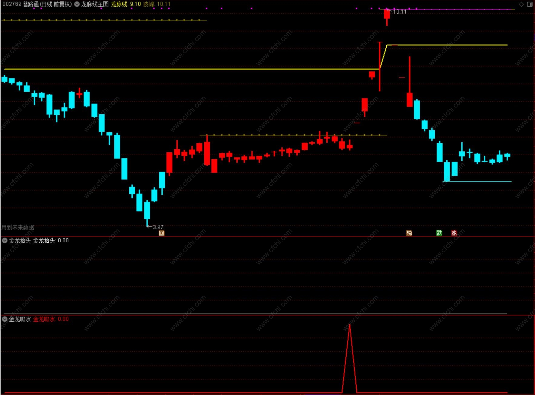 短线指标【金龙吸水】 指标依托最近有过涨停,并且回踩到位,第二天准备拉升位置,短线具有快速增值的潜力,盘中可作预警,预警后当天可介入,预警后后面出现上涨持股,以预警开盘价为止损点,预警第三天破预警开盘价出局。或者结合主图,红K持股,盈利就走,红K变蓝K,止盈或止损。