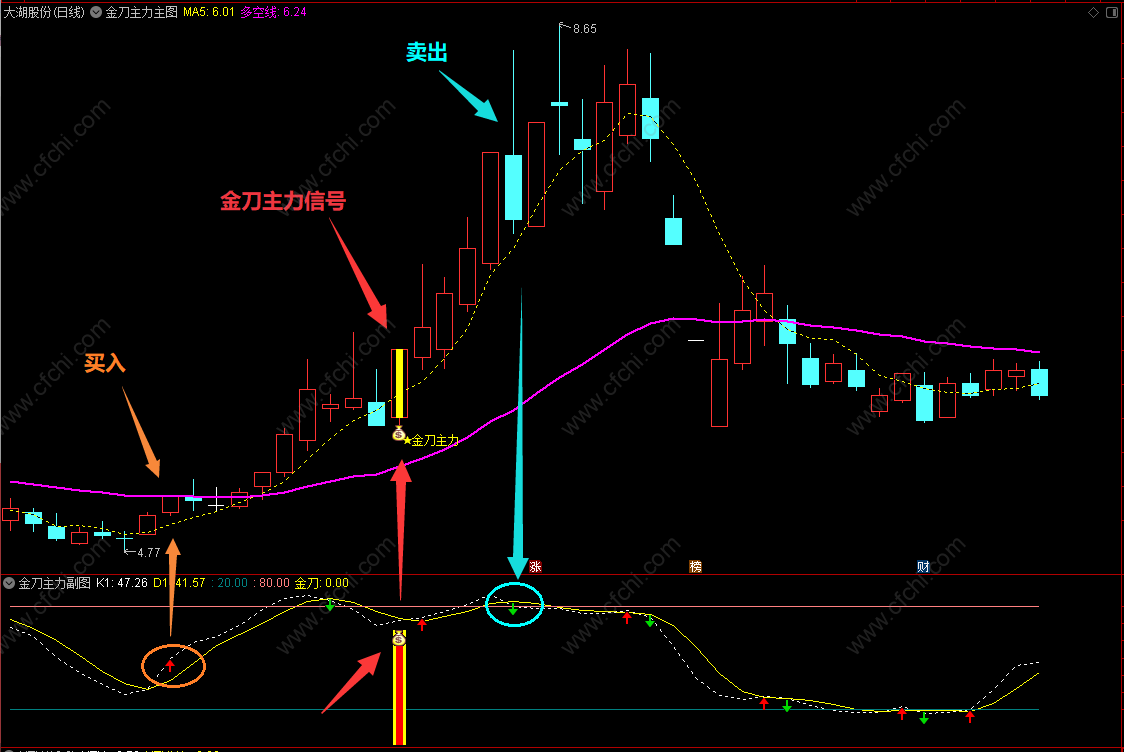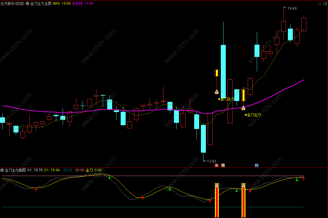 1、“金刀主力”指标,是在号称“波段王者”的超买卖指标上优化而来。