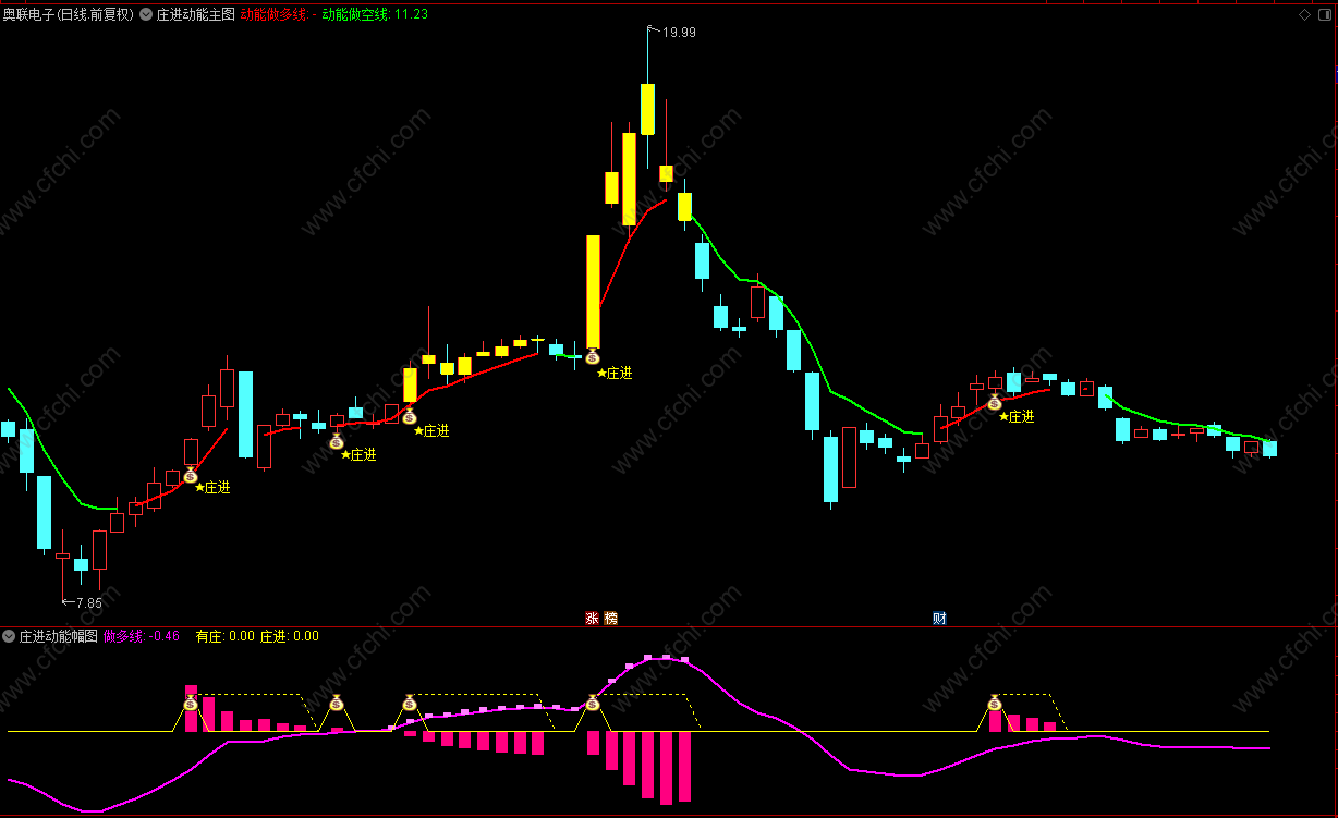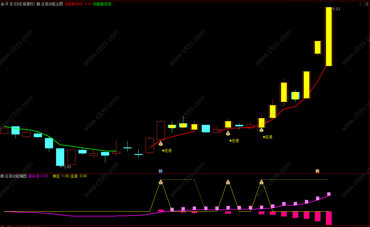 2、副图同时出现“双红柱“,为共振信号,表示”强庄入场“,在对应的主图中显示“黄色K线”;