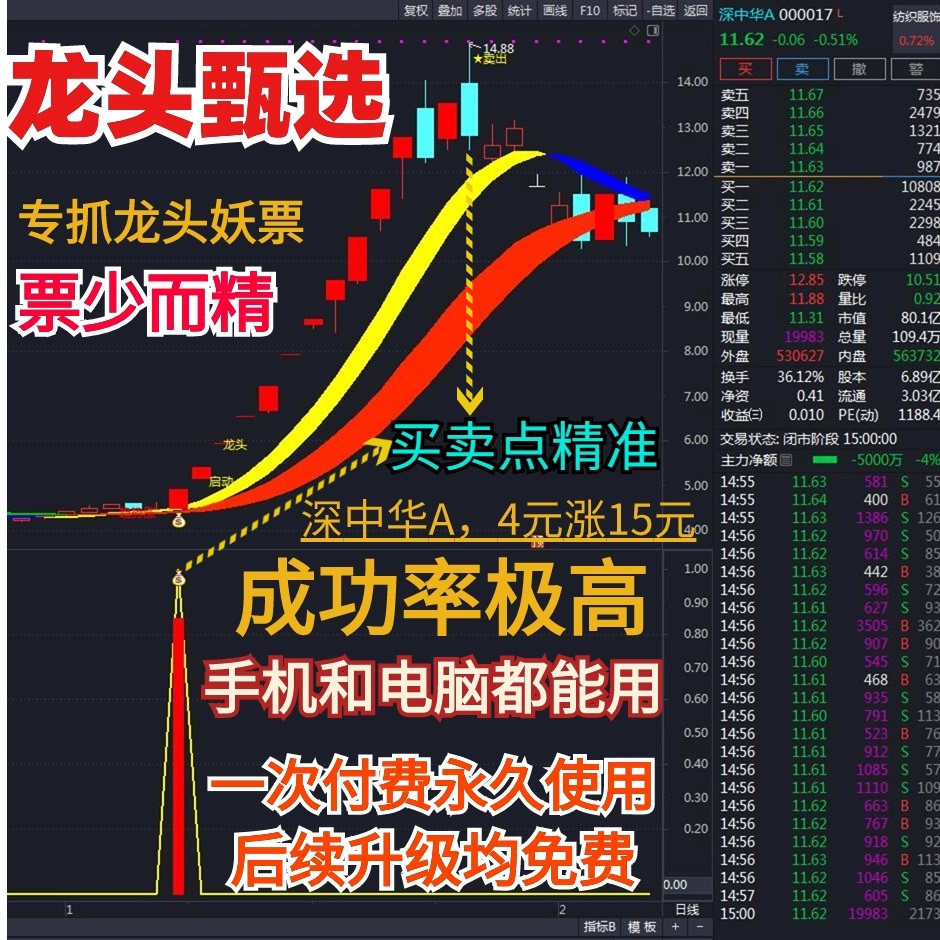 本产品为【龙头甄选】指标及配套学习教程资料,指标无加密,一次付费,永久使用,后续升级均免费,通达信电脑端、手机APP均可使用,均可选股,指标内含【龙头甄选】指标完整版(主图+副图+选股+预警)集成在一起,有指标配套使用说明书学习资料,也有安装教程资料,也可以购买后咱们这边帮您远程安装设置好。