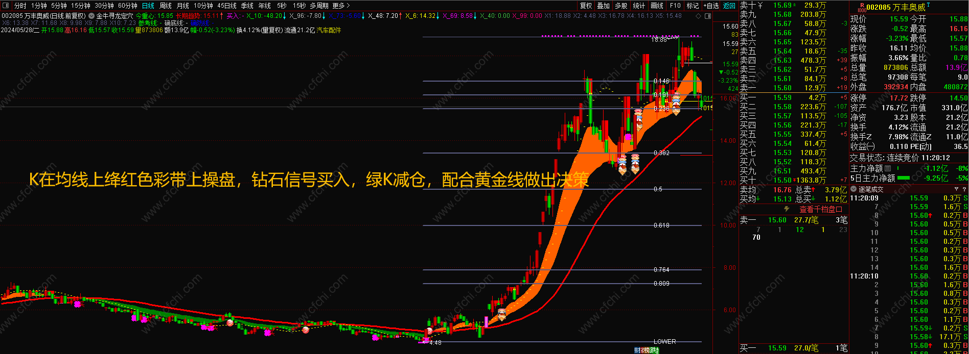 K在均线上绛红色彩带上持股,钻石信号买入,绿K减仓,绿色彩带持币,破均线清仓,配合黄金线做出决策