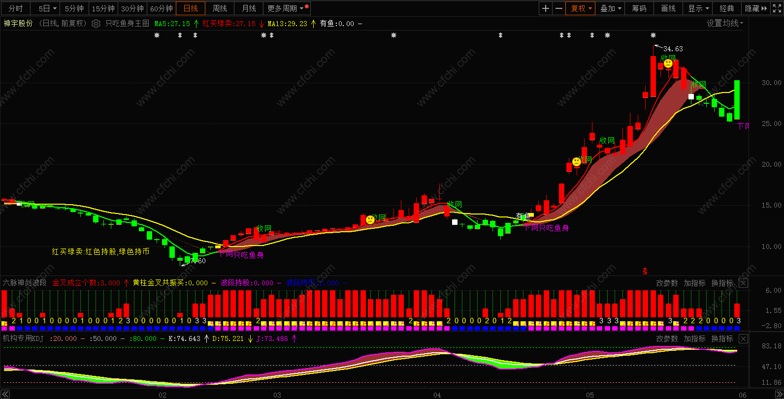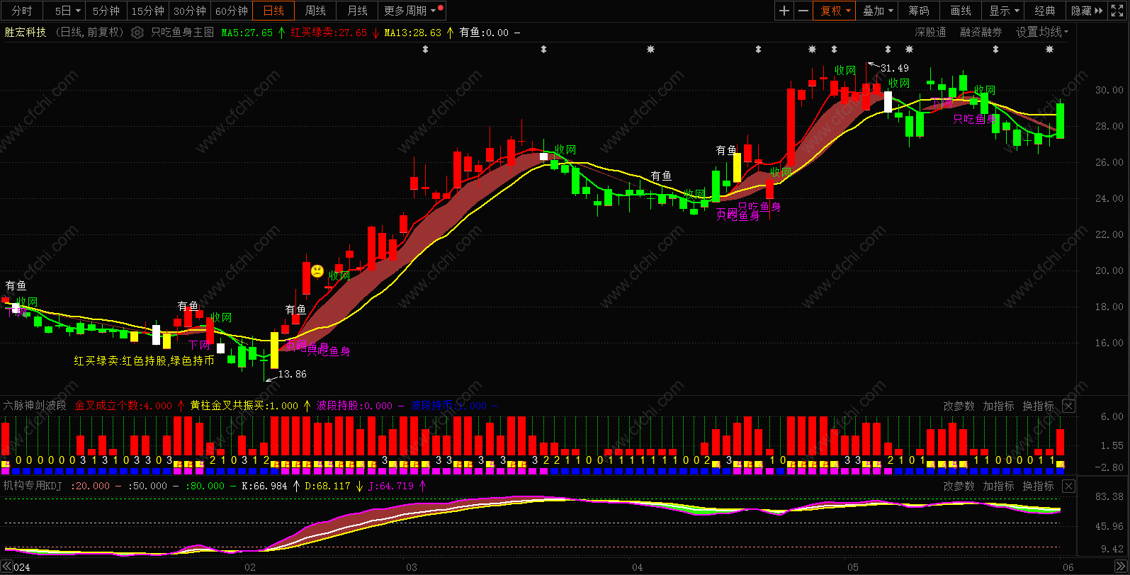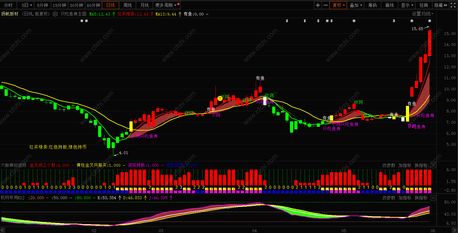 吃鱼身主图+六脉神剑波段副图+ 机构专用KDJ副图+六脉波段选股.