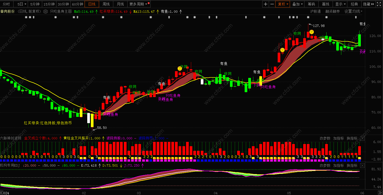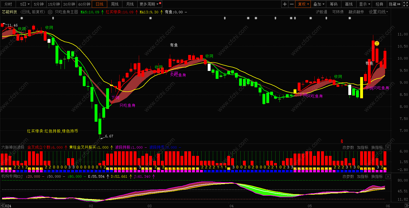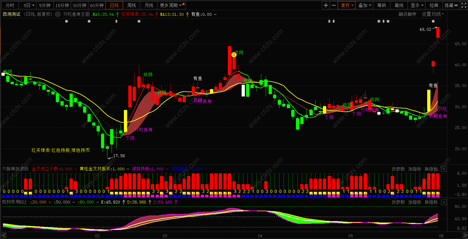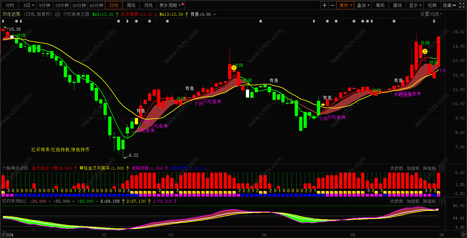 吃鱼身主图+六脉神剑波段副图+ 机构专用KDJ副图+六脉波段选股.