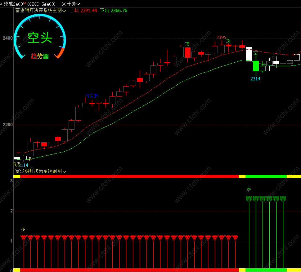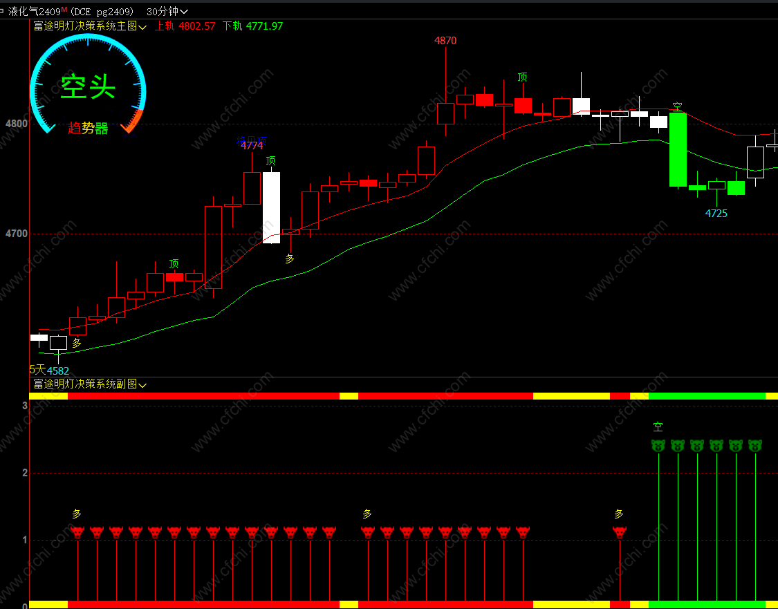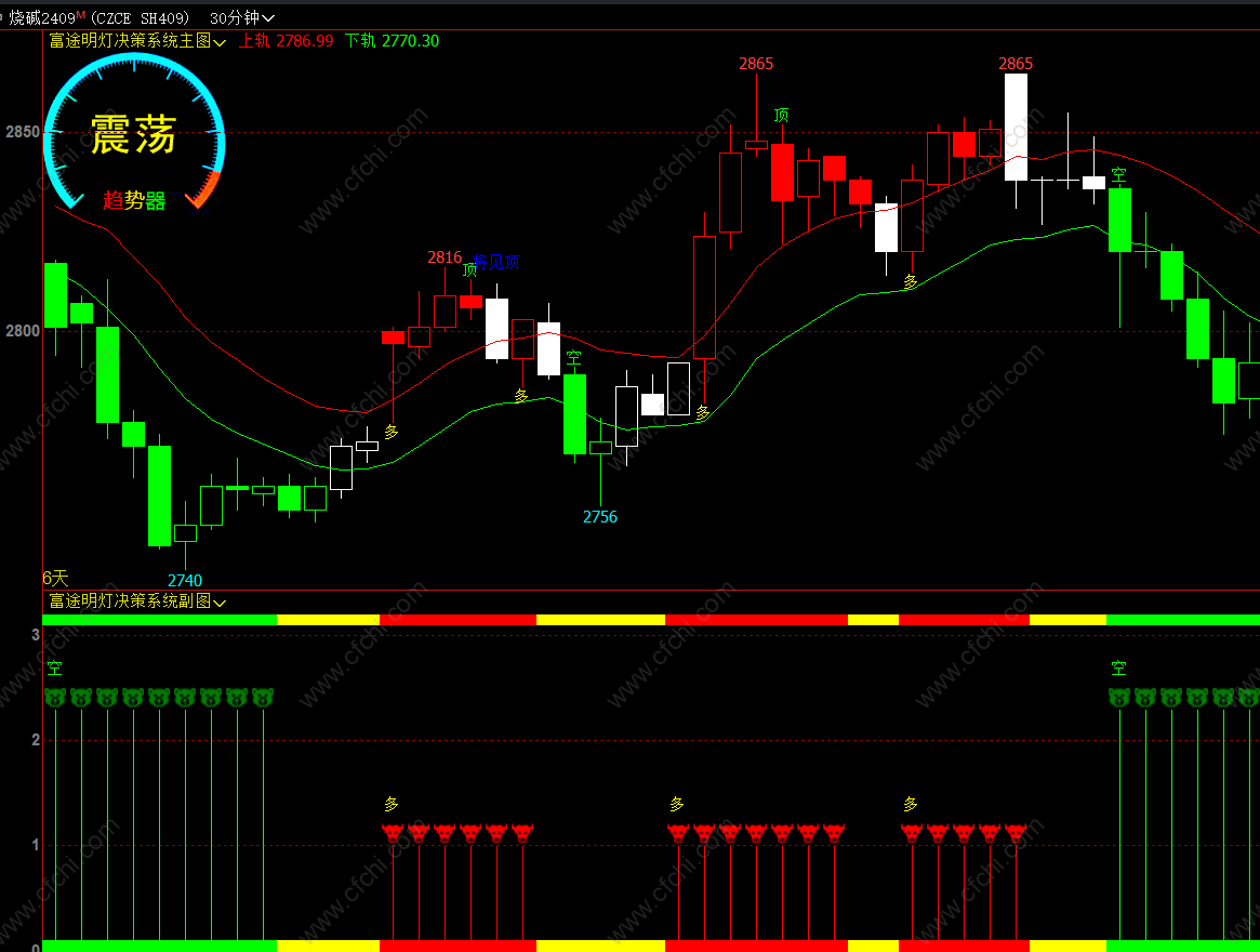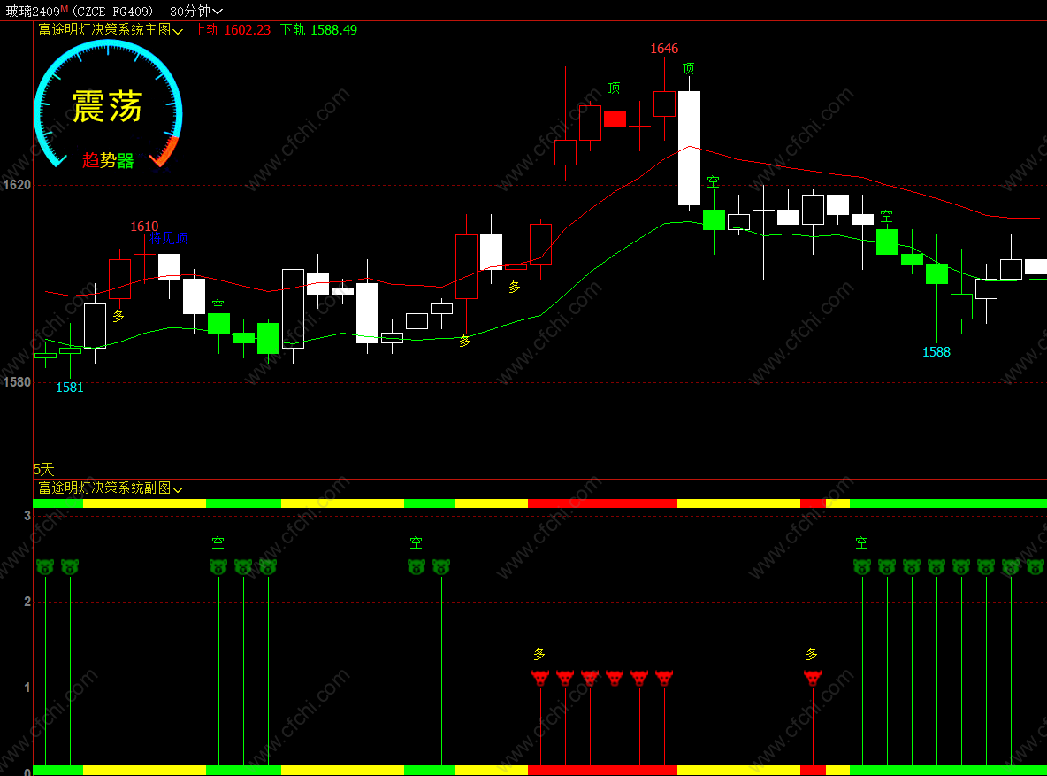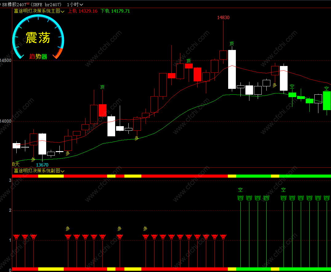 1,左上角趋势器用来判断当前行情,分为多头,空头和震荡三种;