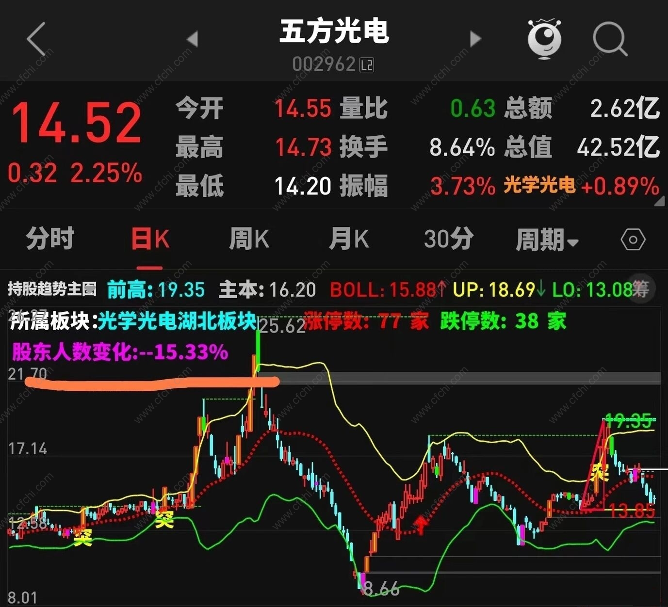 主图屏幕显示近来几期的股东人数变化,如果连续几次财报股东人数减少,就会显示累计的减少幅度,如果连续增加股东人数,也是一样显示累计增加幅度百分比。