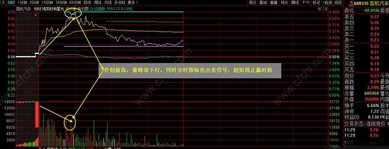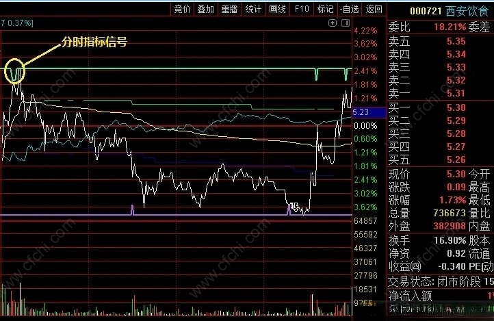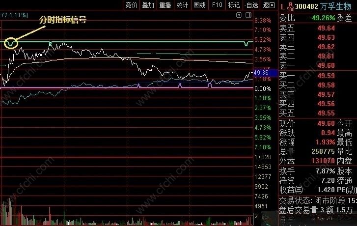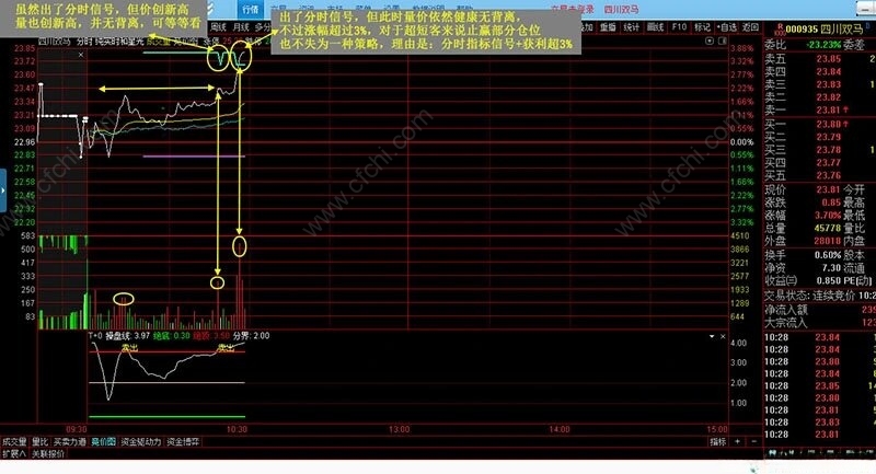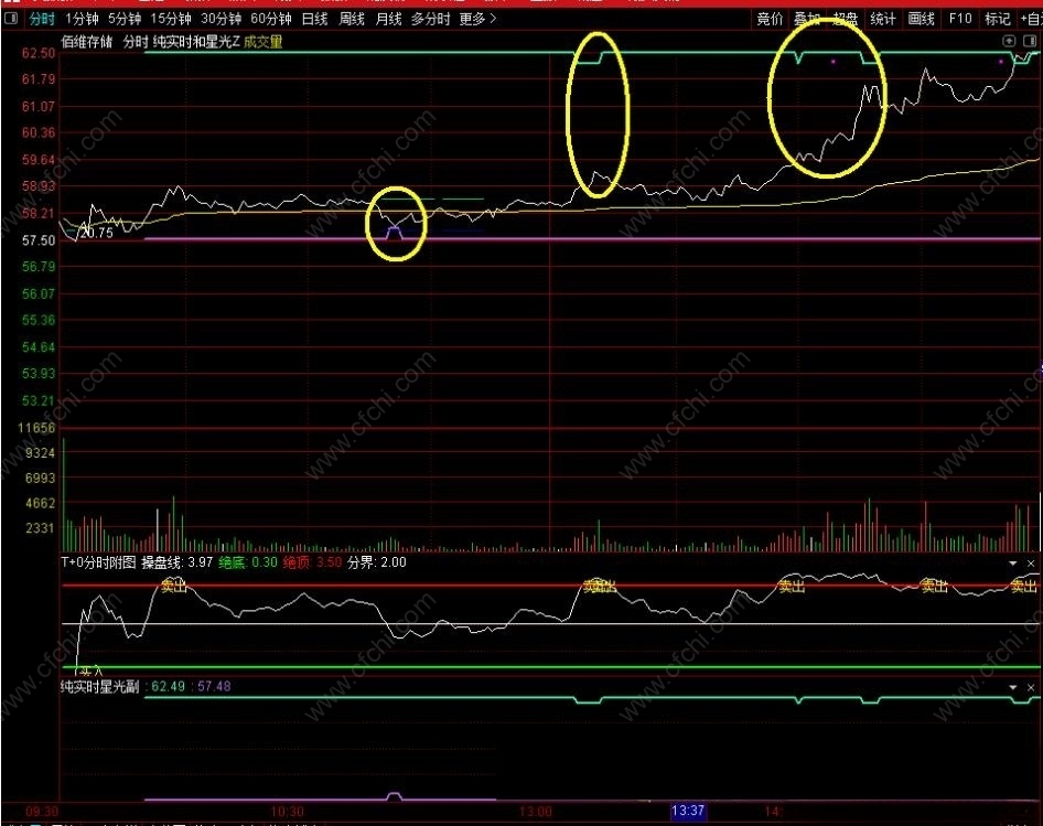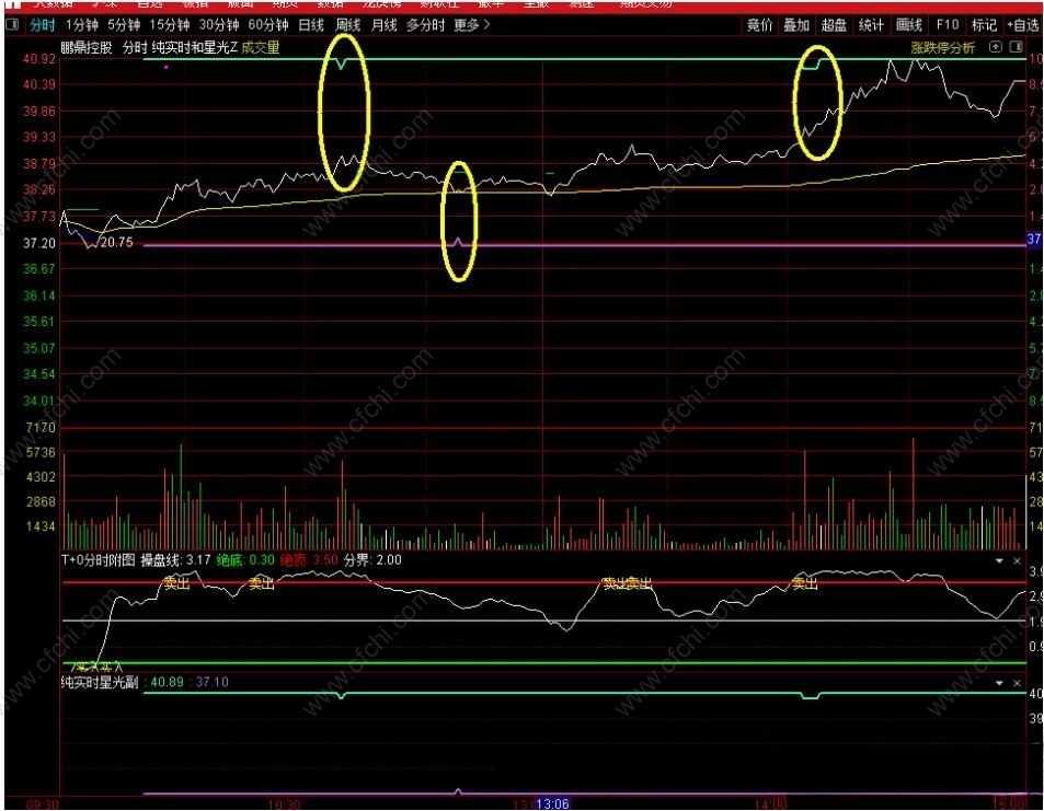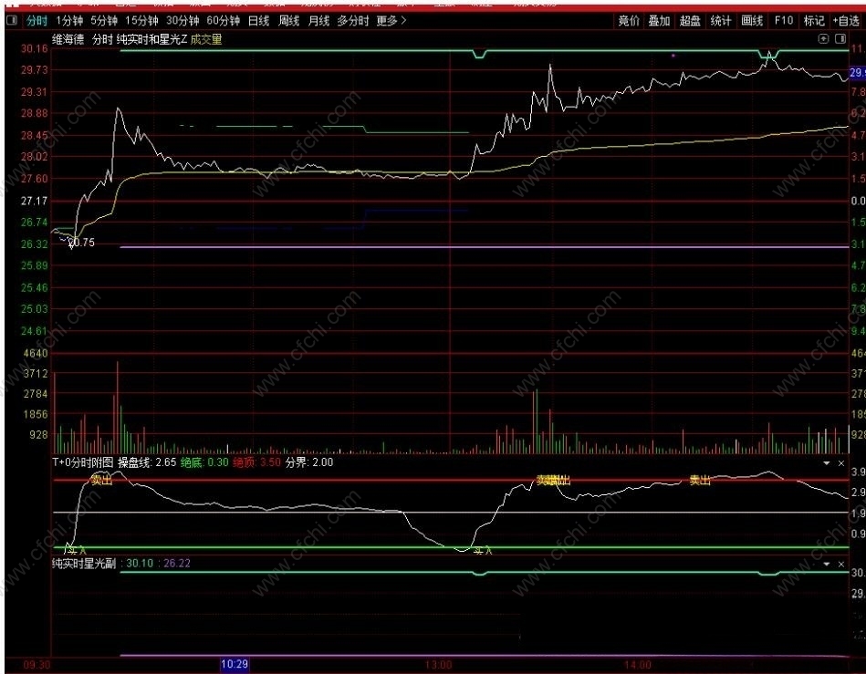 分时主图指标每天大概从9点50开始计算,一条绿色线,一条紫色线,当分时出现高点的时候,绿色线会出信号,当分时出现低点的时候,紫色线会出信号。超短线操作方法之一。分时T0附图这个是全天分时都会显示的,适合的品种是分时当天振幅较大的个股,如何全天横盘的那种类型就不适用,没有振幅就无法做高抛低吸的。