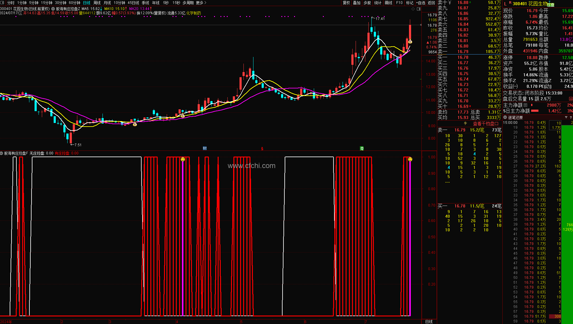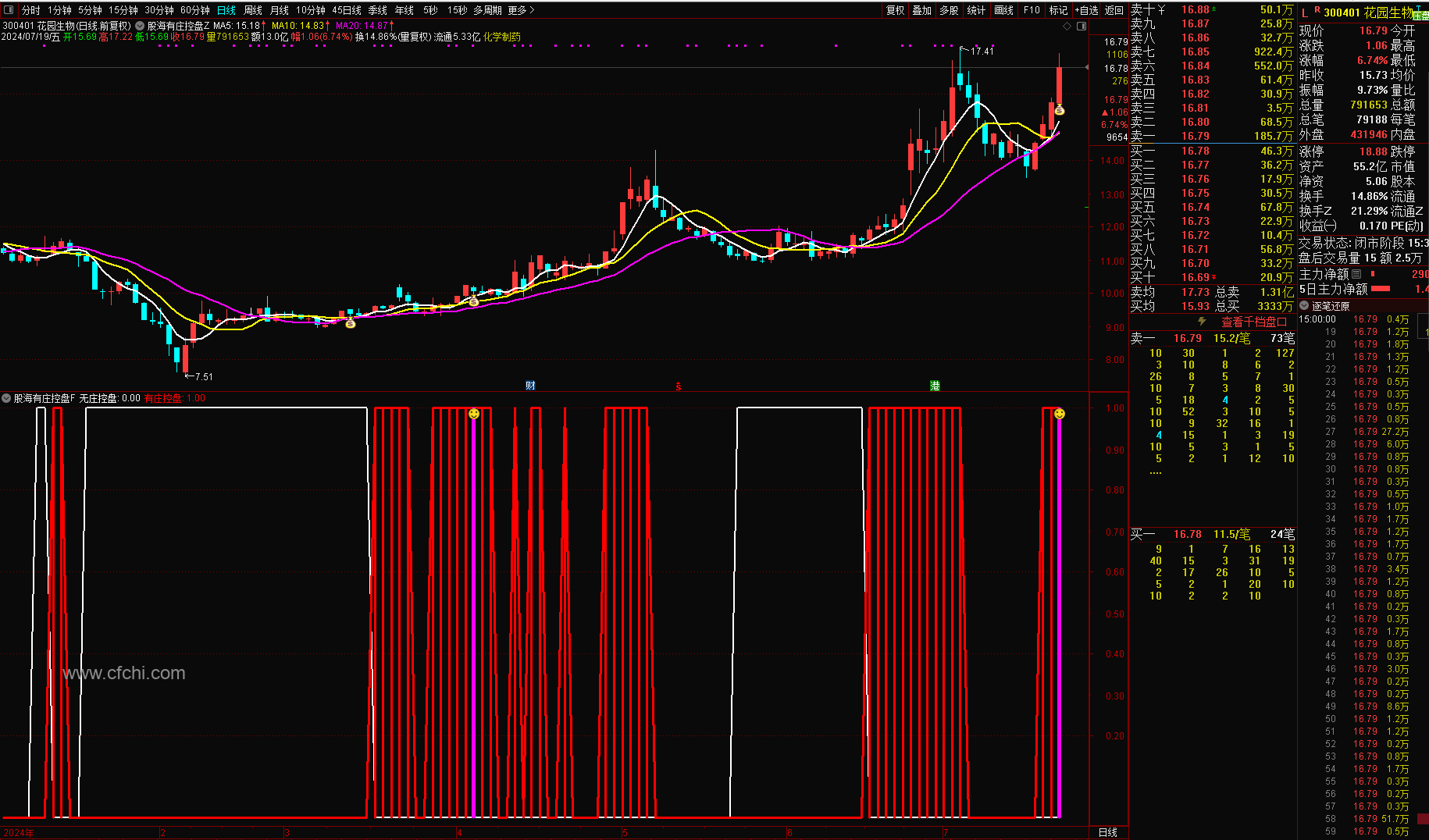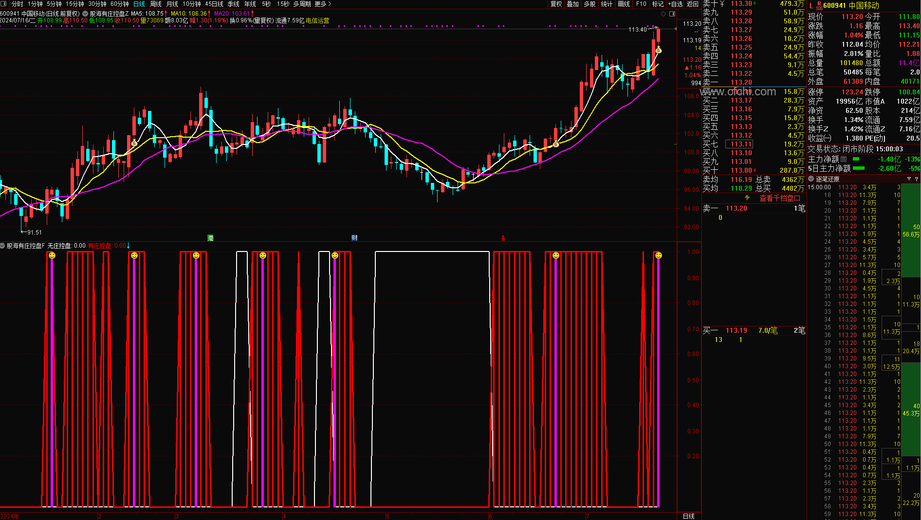 2、副图红色为“有庄控盘”,白色虚线为“无庄控盘”,没有显示的区域为“庄家出货”;