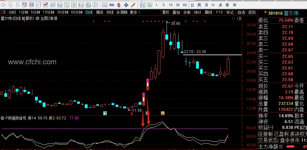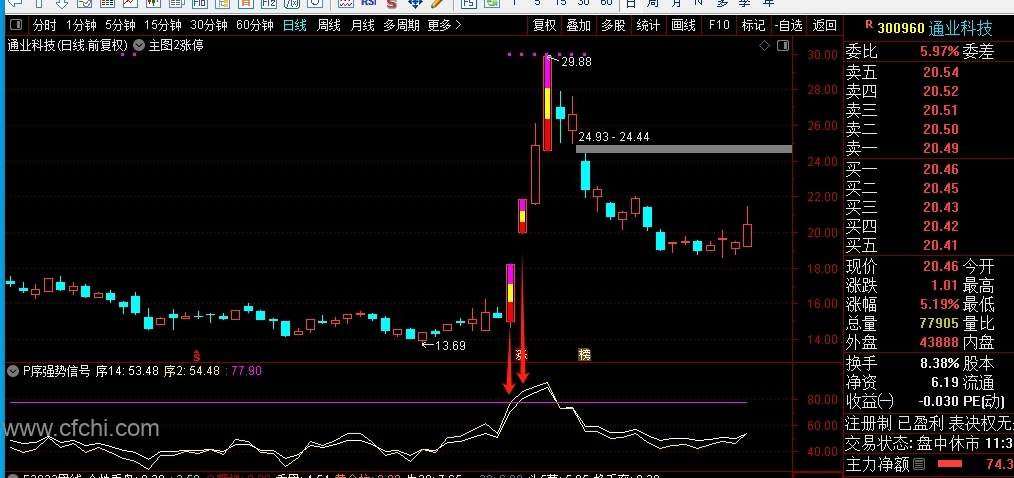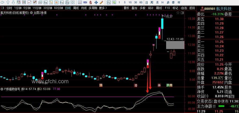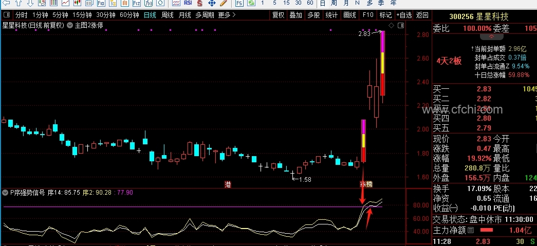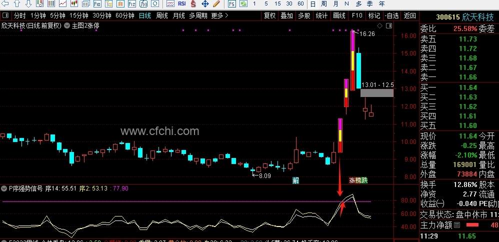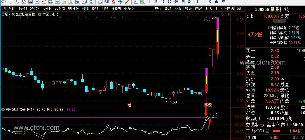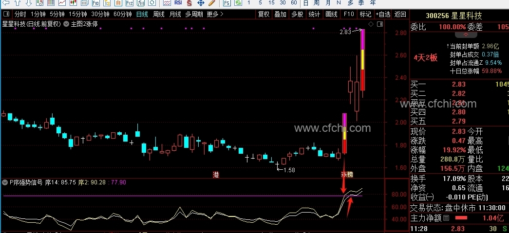 (副公式P序强势信号,强势股信号放大器,只要上77点9就是标准版强势股,一进二非常完美的组合,其它的平台突破也适合运用。)
