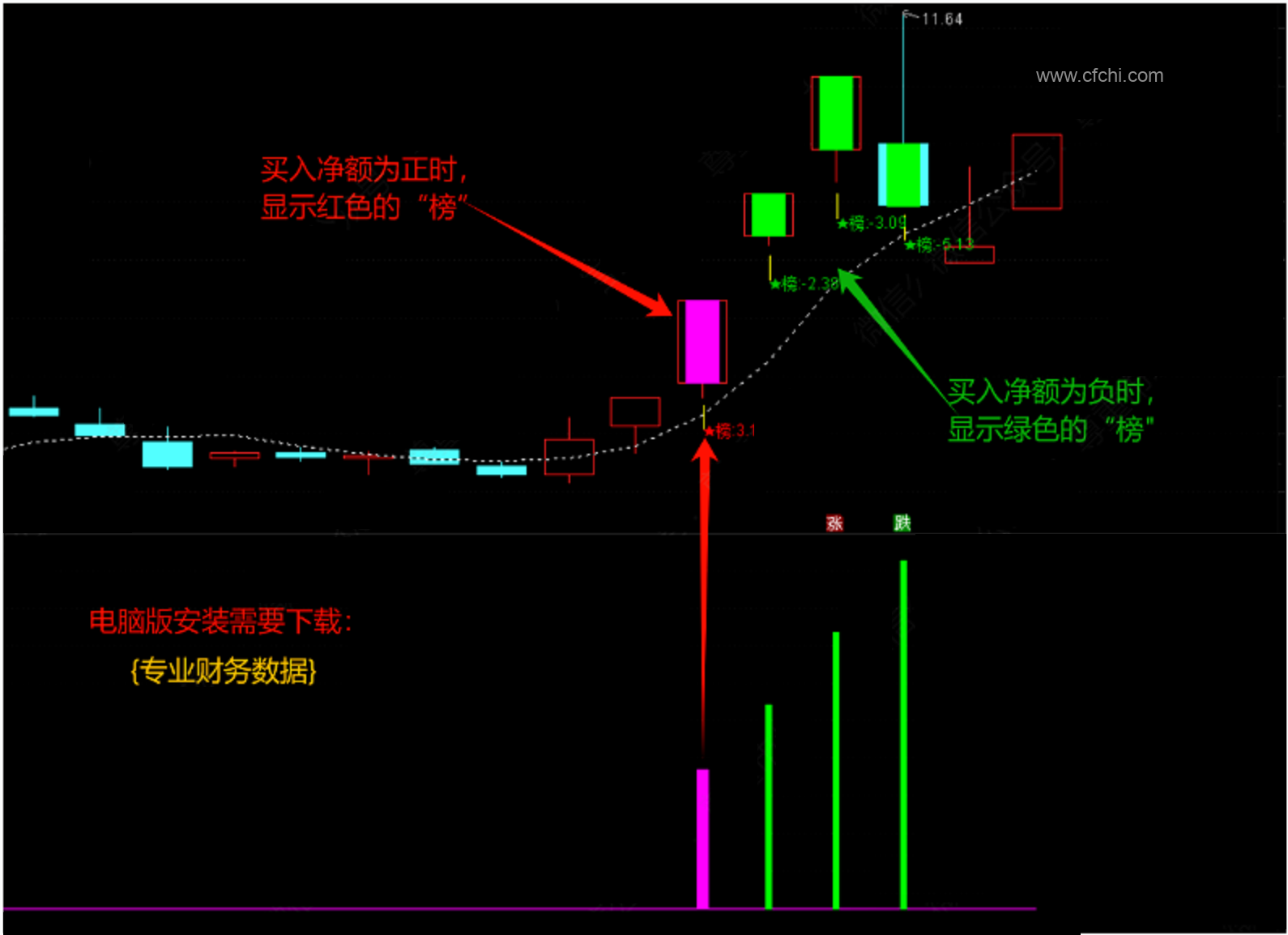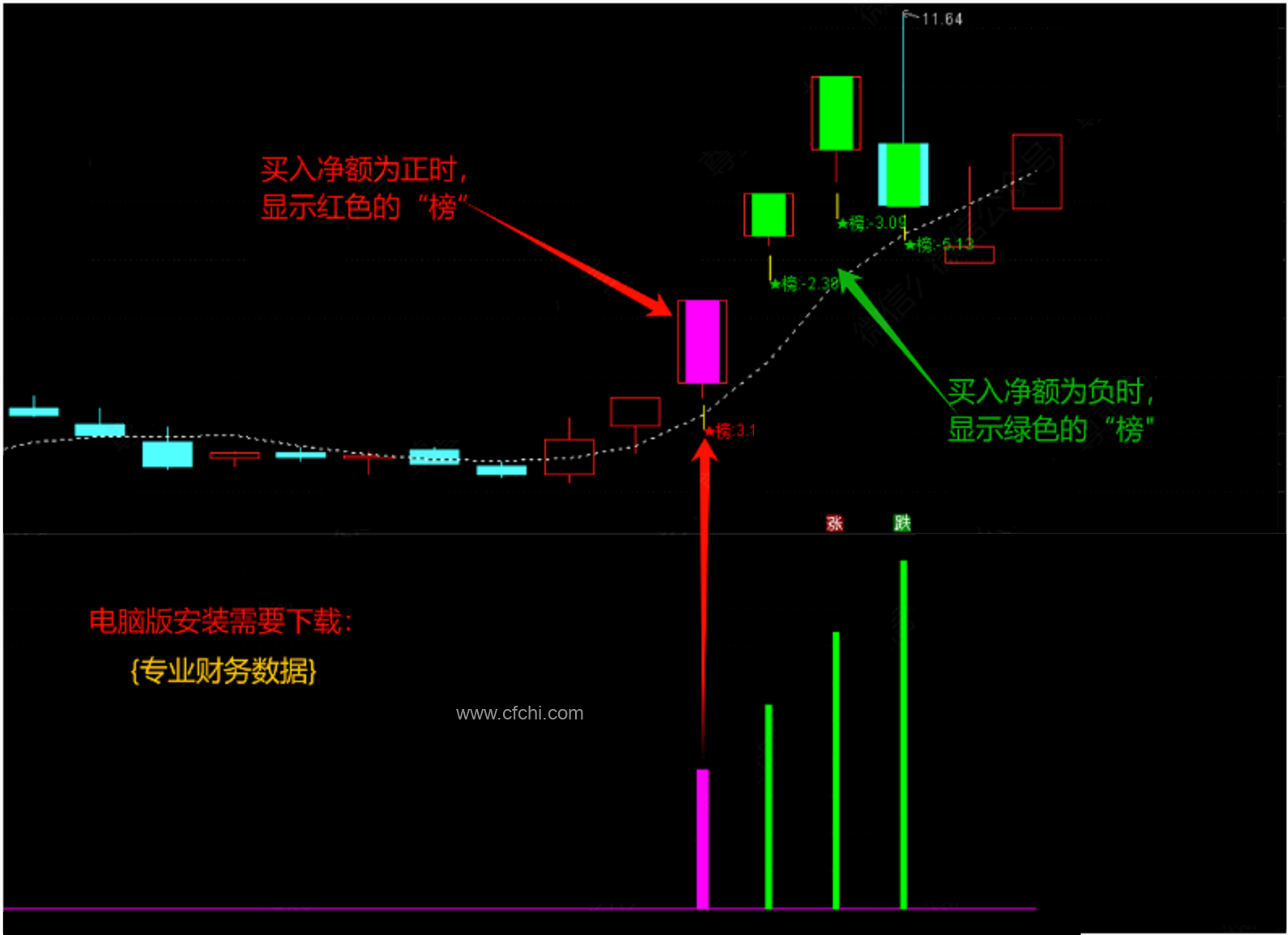 1、主图,买入净额为正时,下方显示红色”榜“;