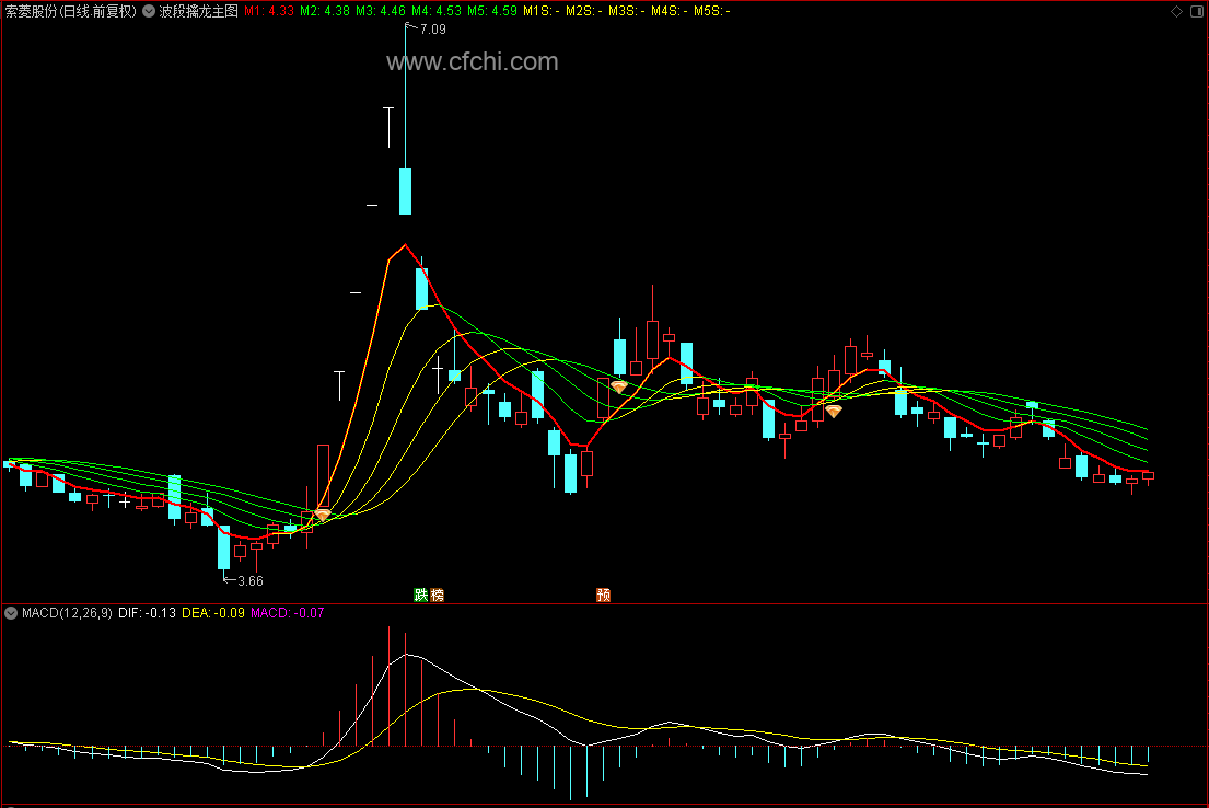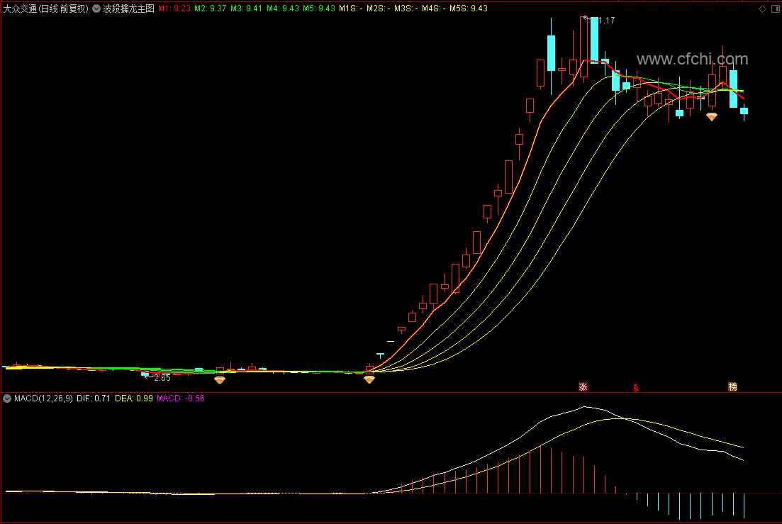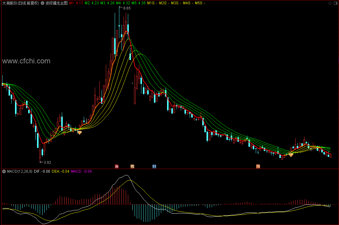 当所有曲线都是向上运行的时候,原来的四条绿色曲线会变为黄色曲线,而原来的红色曲线向上突破之后,会显示黄红相间的颜色;