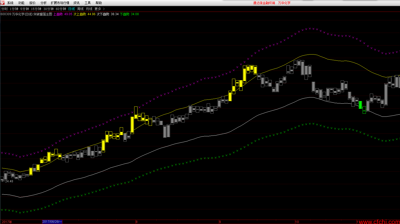 趋势强度:=IF(C>次上趋势,IF(C>上趋势,4,3),IF(C>次下趋势