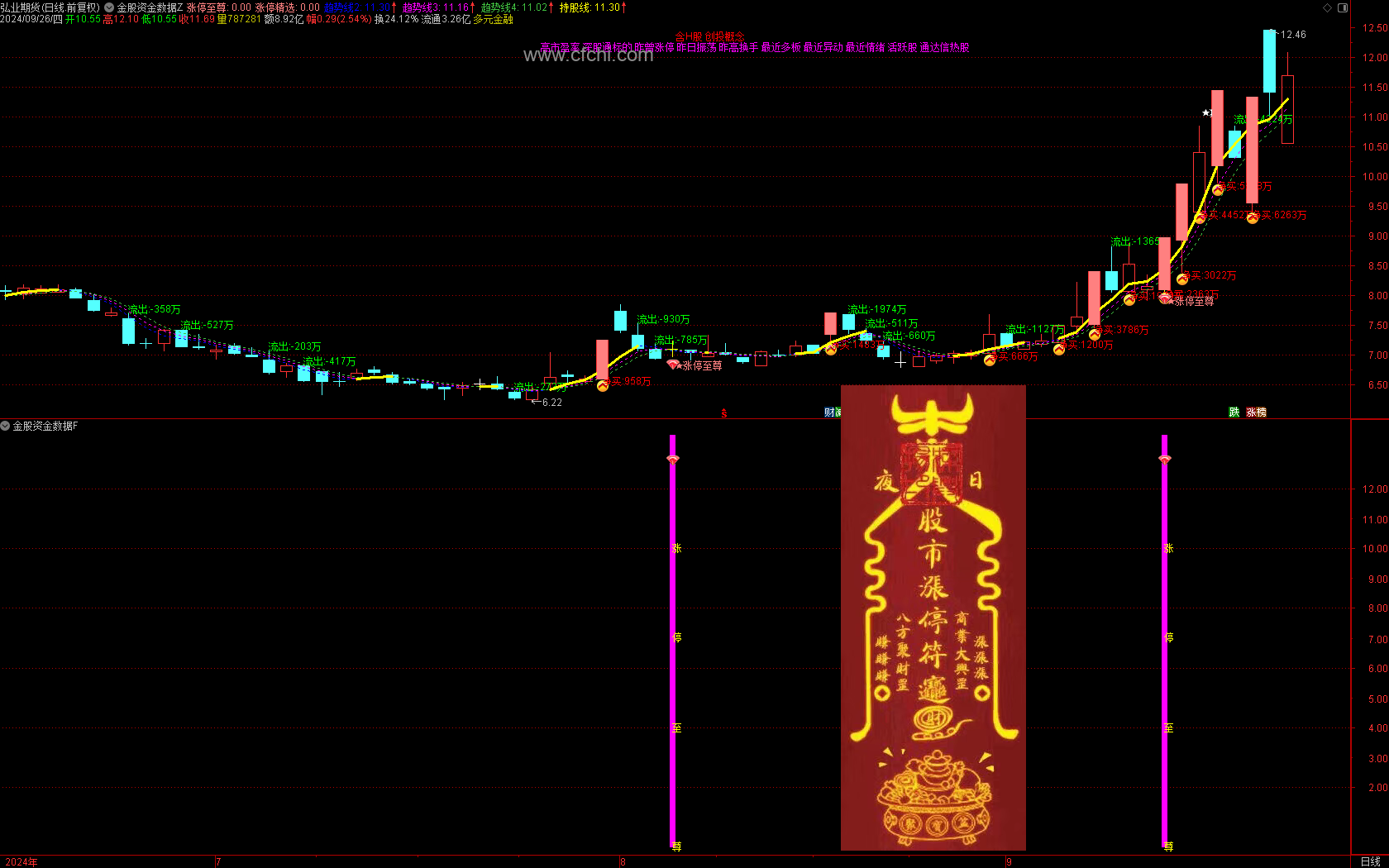 指标说明:一款会在主图K线中自动显示个股当天盘中净流资金数据与资金占比,即时显示与个股趋势多空跟踪功能与抛点设计功能的指标公式。其中的涨停至尊信号是基于:强势股短暂的洗盘回头设计以接力的形式设计发出至尊信号,当行情处于趋势向上时可盘中预警介入,或者尾盘2点半选股,要注意出现至尊信号时且K线上显示流出尽量不操作。资金占比超过15%以上:个股总体位置较低时 意味着主力资金过于介入明显,大概率在近期会有一波拉伸。资金占比处于5%-15%之间:代表当日个股主力资金介入处于一个异动状态。资金占比低于5%:一般不考虑此信号操作。