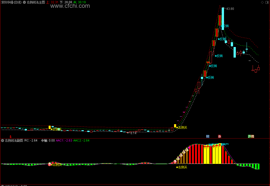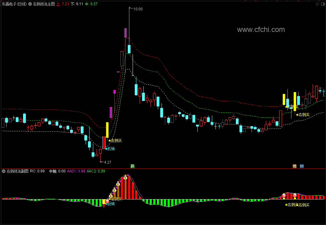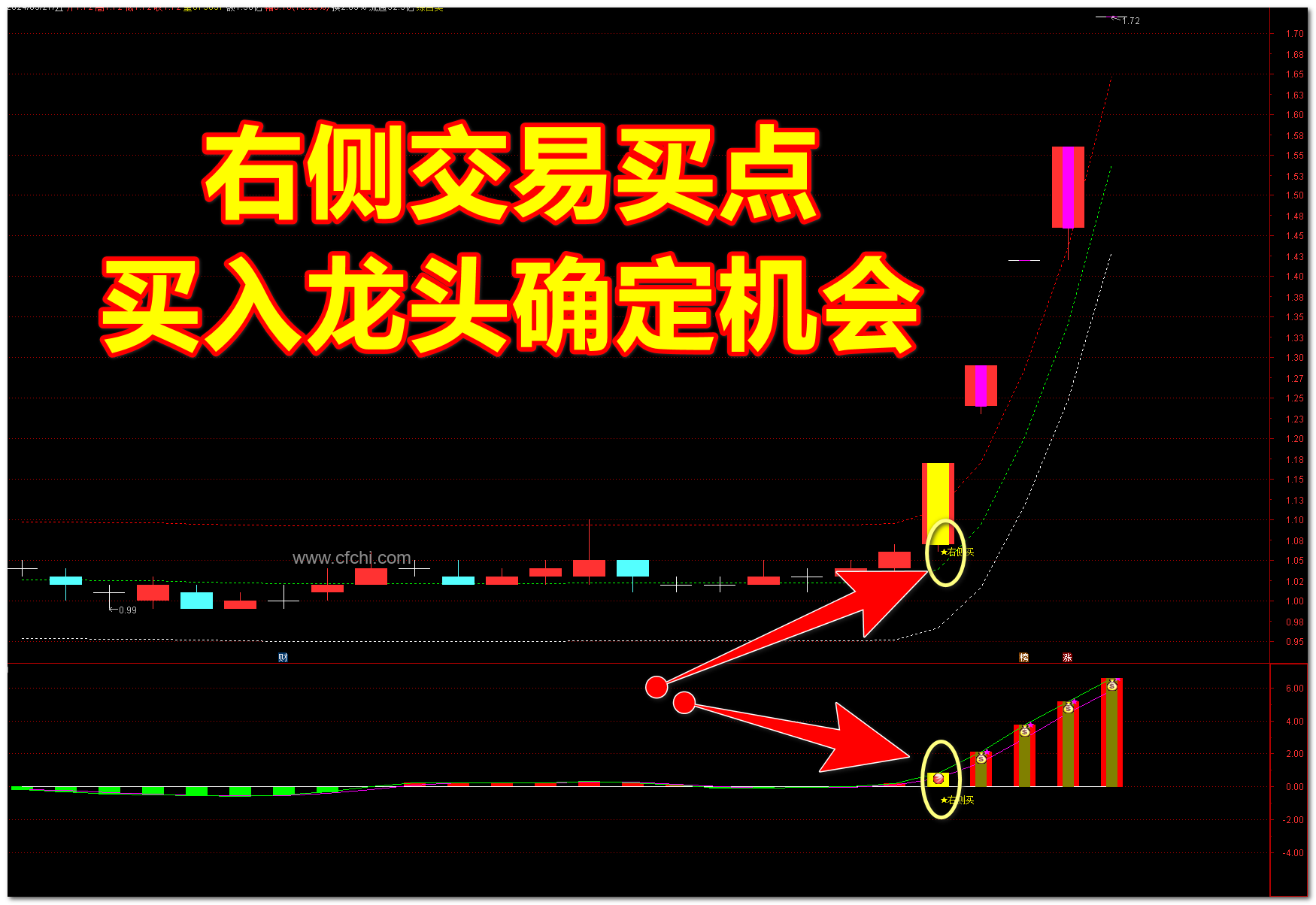 当主图出现“右侧买”信号时,同时观察副图量能的变化。如果副图中量能明显放大,说明主力资金已经入场,买点更具确定性。