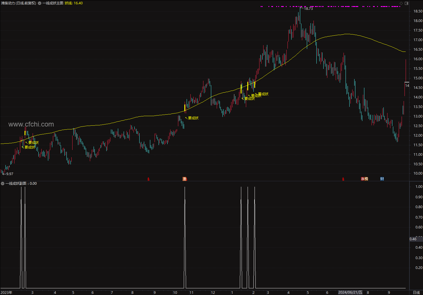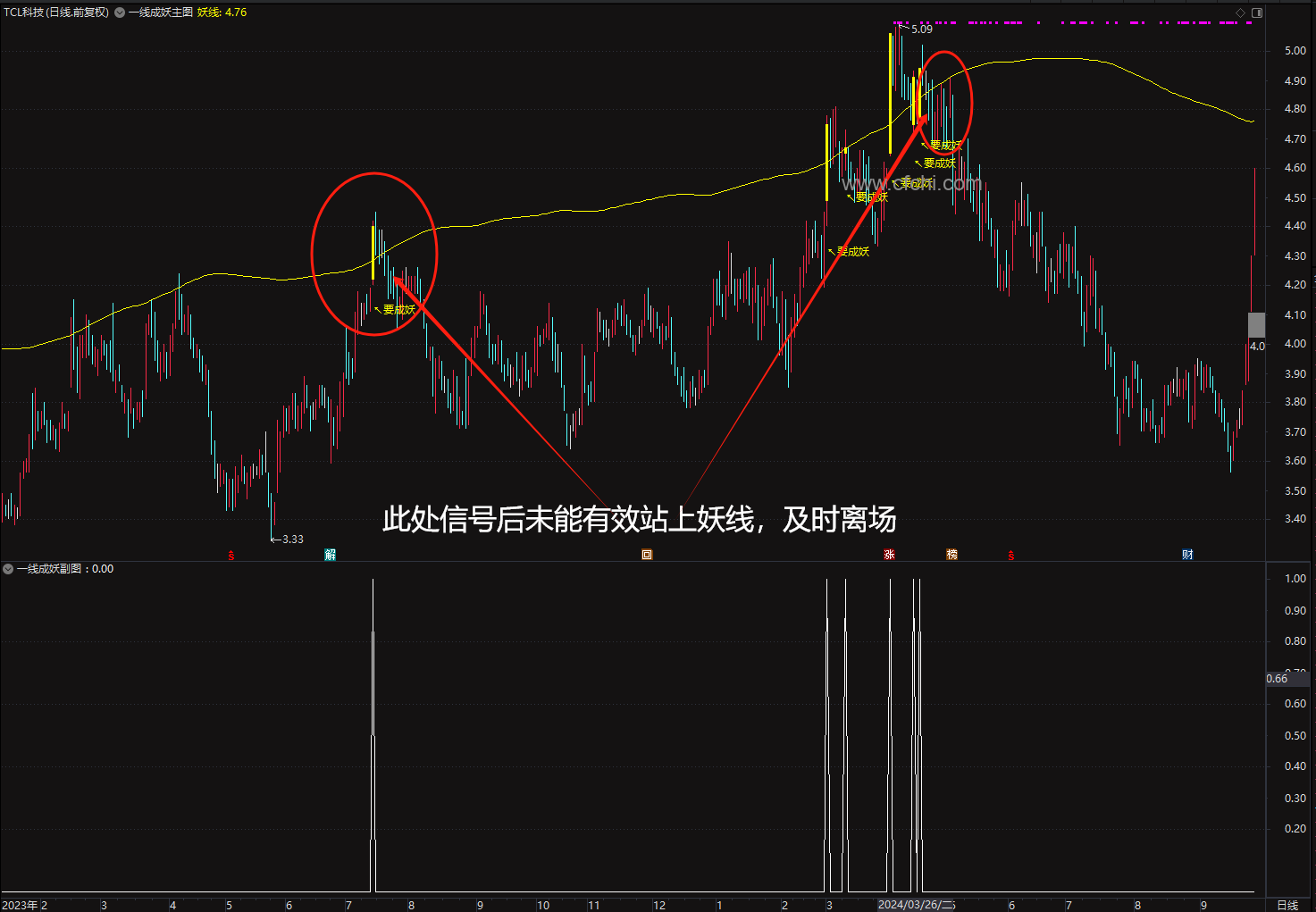 信号发出后,注意观察股价和妖线的关系,以妖线趋势向上为原则,股价围绕妖线(或者妖线上方)运行,或者股价跌破妖线短期内能收回继续持股,跌破妖线后收回不能有效站上妖线,要及时离场。