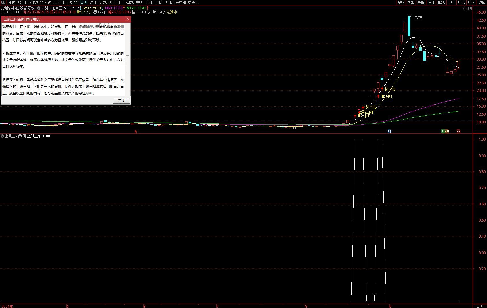 综上所述,上跳三阳战法是一种基于K线组合形态的短线交易策略。在应用中,投资者应关注缺口、成交量等关键指标,并结合市场信息进行综合分析。同时,也要注意控制风险,确保交易的安全性和稳健性。