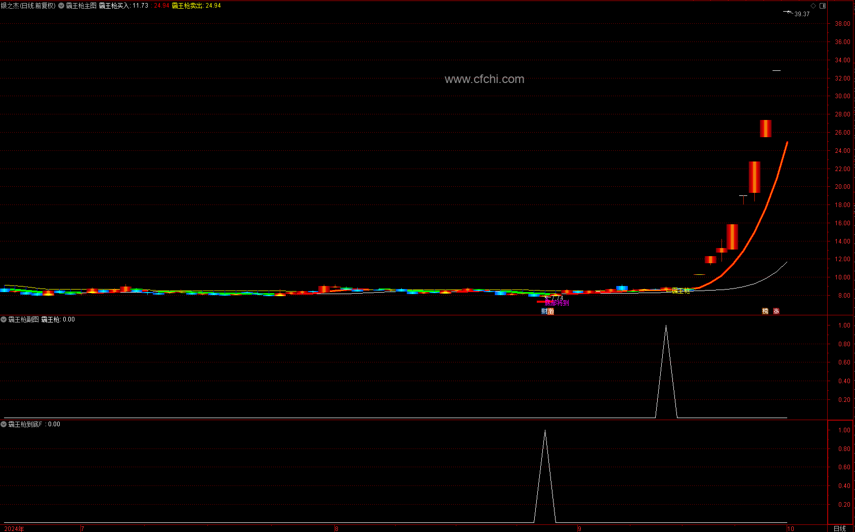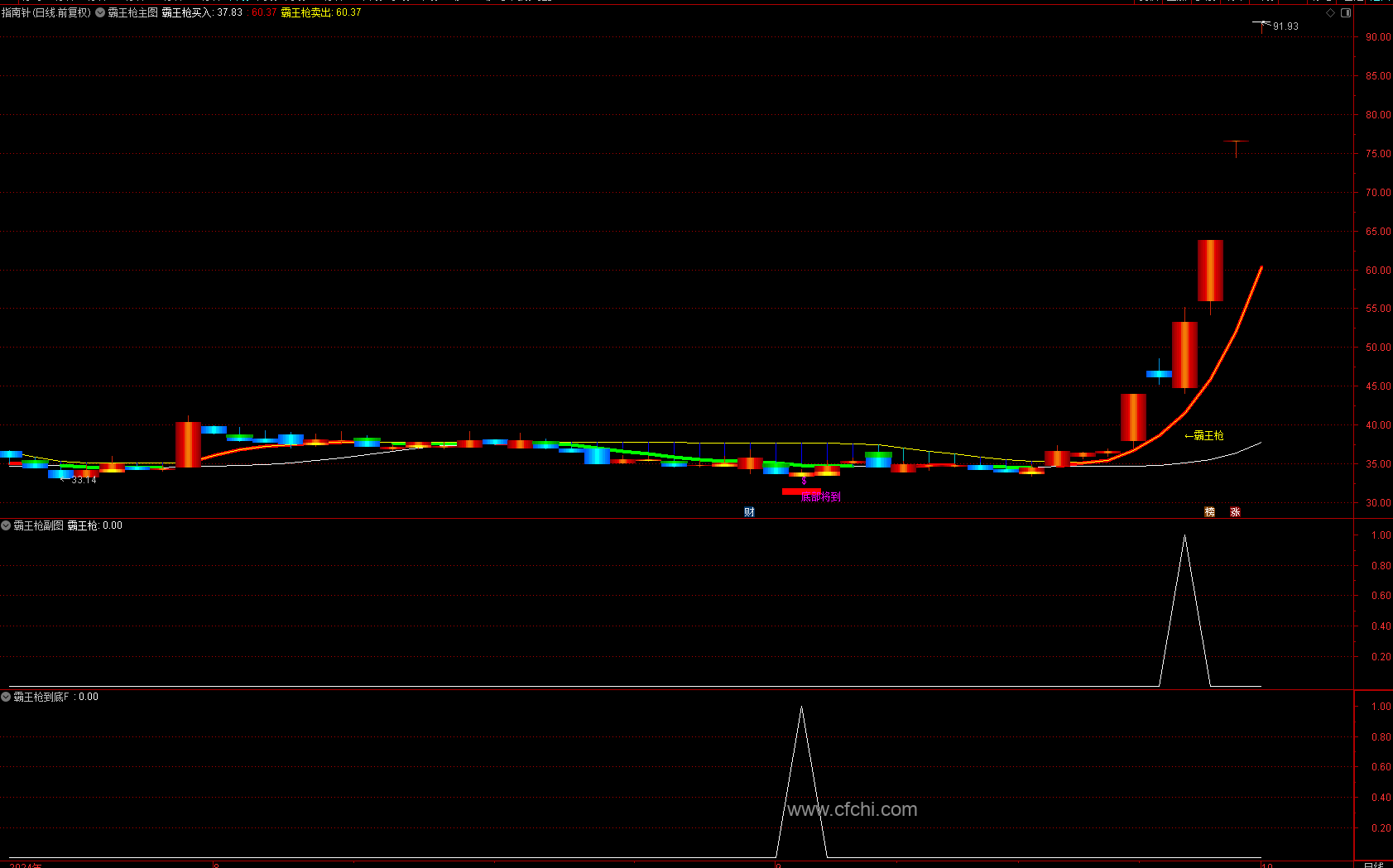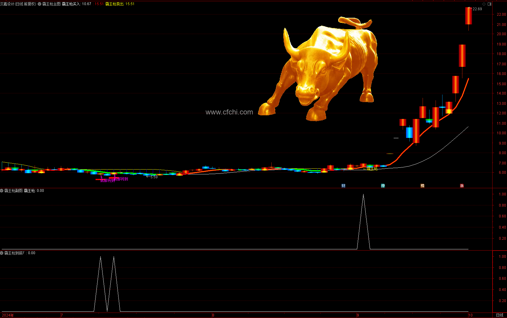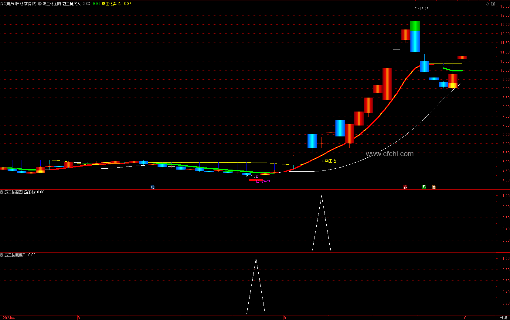 一、当主图上出现“霸王枪”这3个字时,上车!这意味着该个股很可能已经突破了前期的压力位。这通常是庄家在完成打压股价后的反转点,也就是庄家准备拉升的起点,后期上涨有潜力。