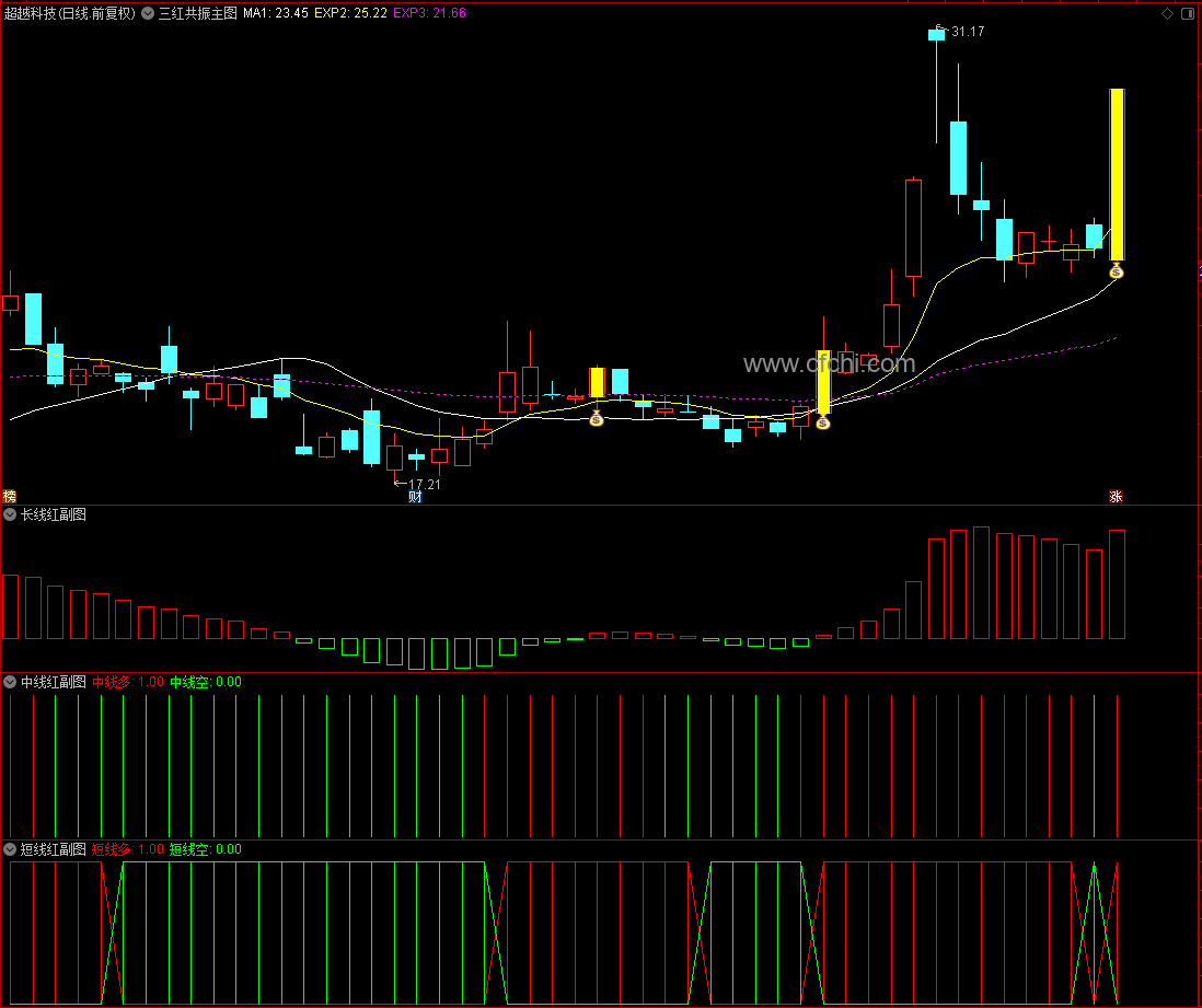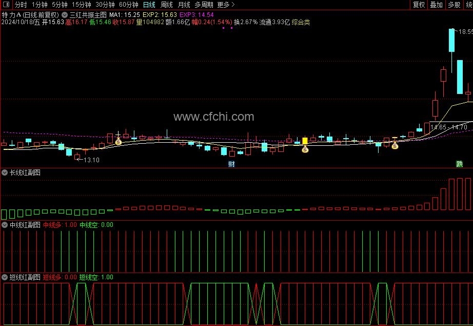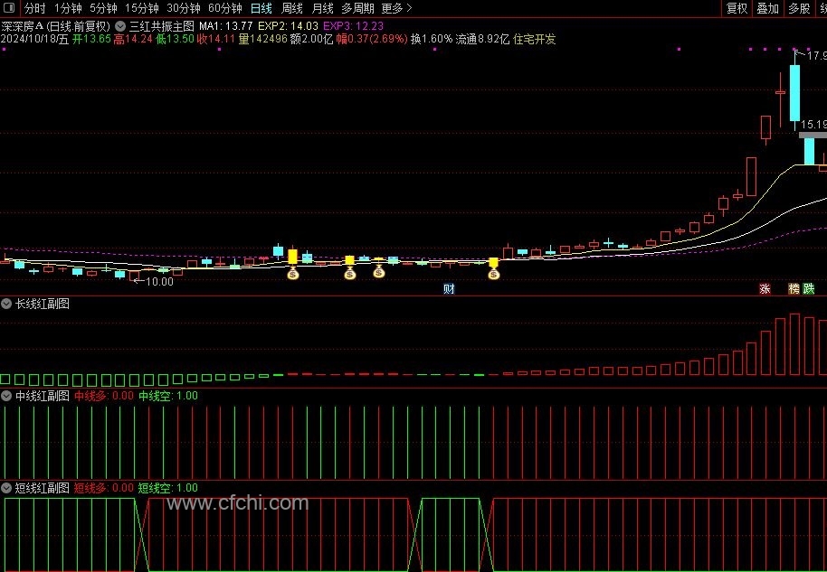 1、三红共振:指的是短线、中线、长线全为红色时的共振信号;