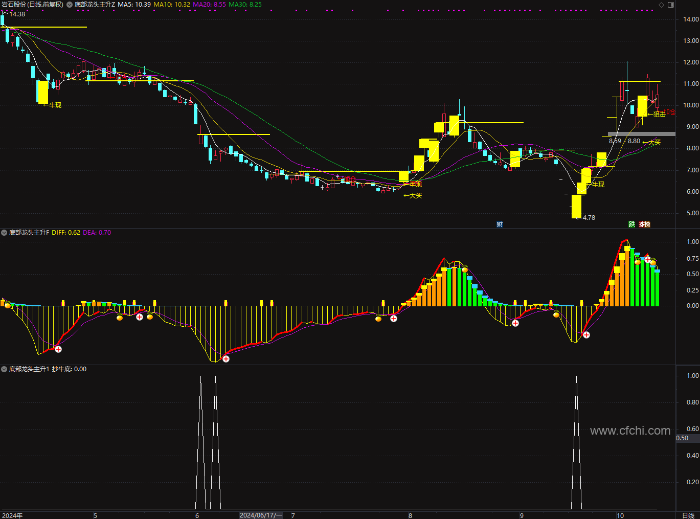 (通达信“底部抓牛+龙头主升”主图副图选股指标)