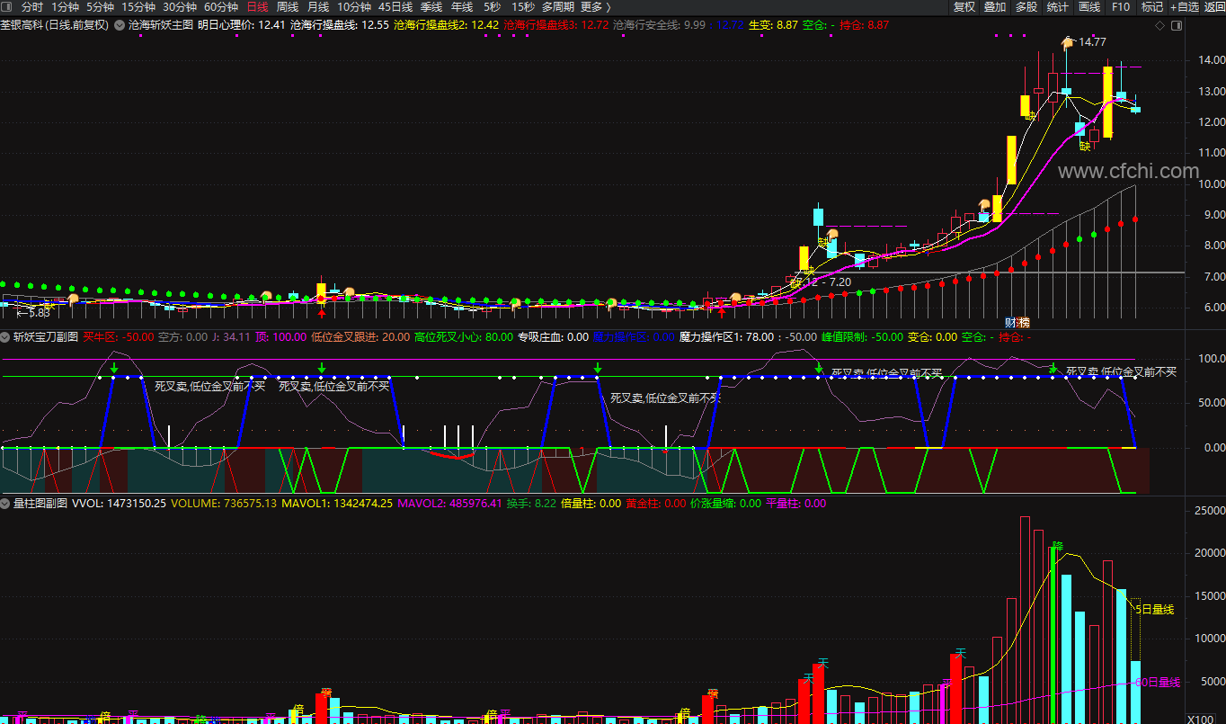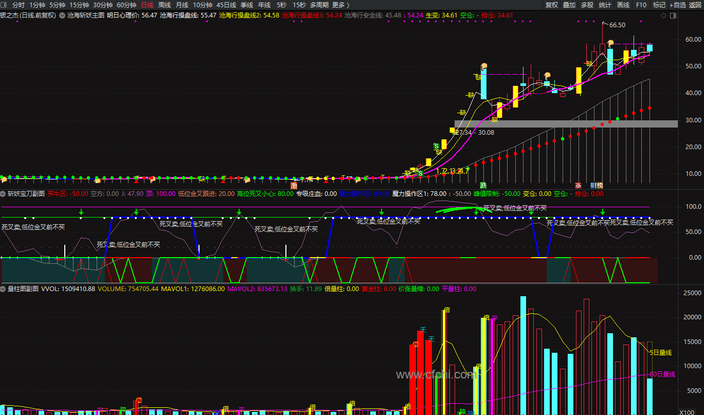 指标名为“沧海斩妖”套系指标,指标包含一个主图和两个副图