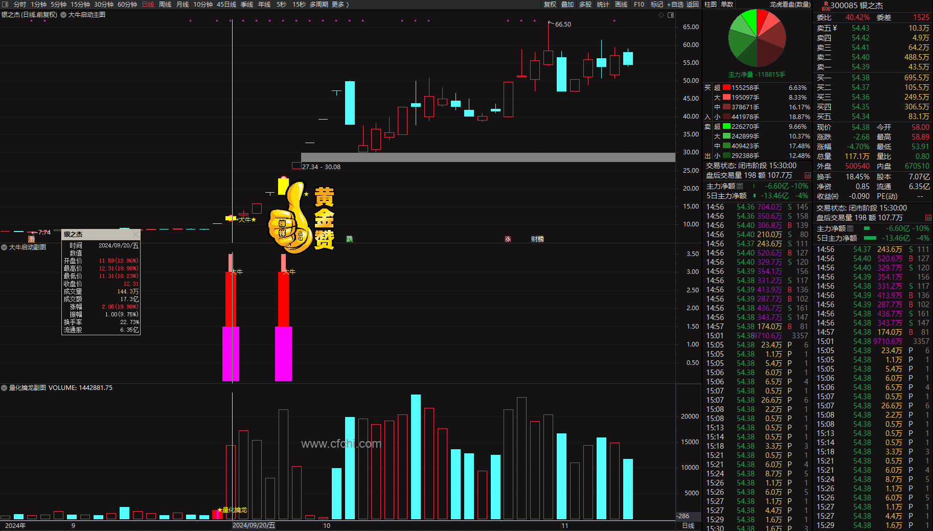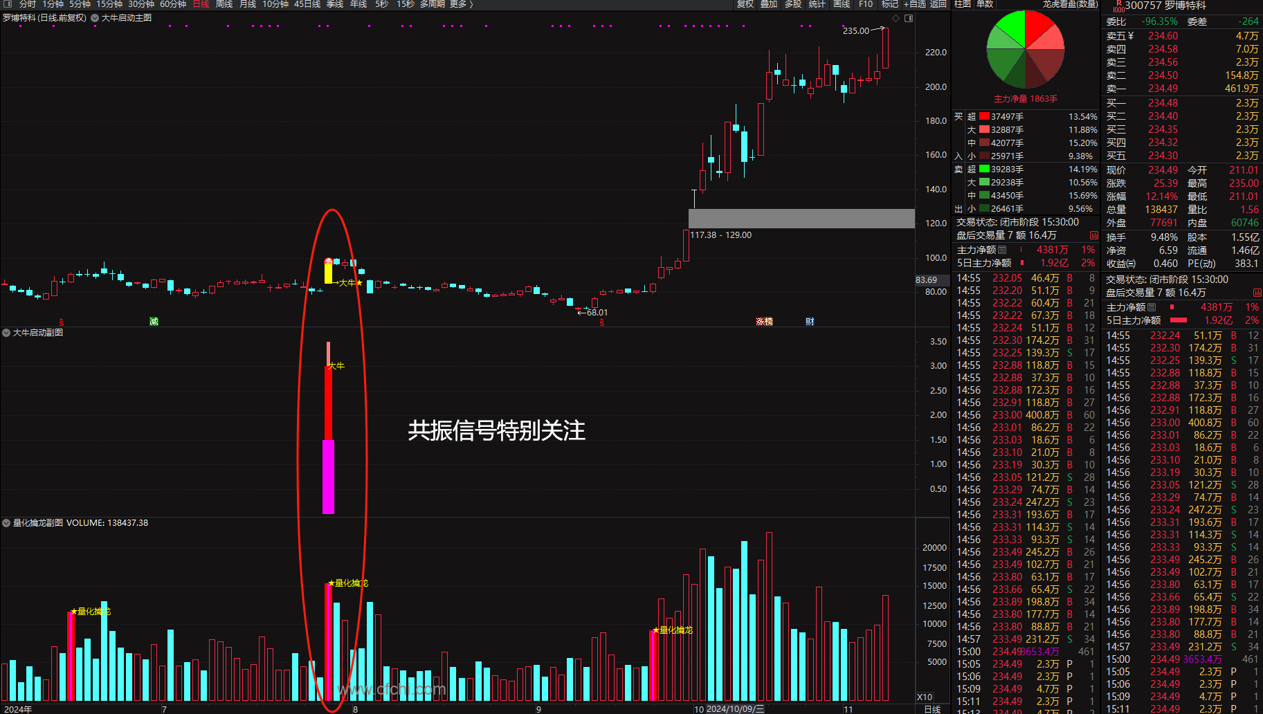 简明信号展示:当捕捉到大牛股时,分时图上会显示红色、紫色的线条,同时伴随黄色**“大牛”**字样,帮助我们一目了然地掌握市场趋势。