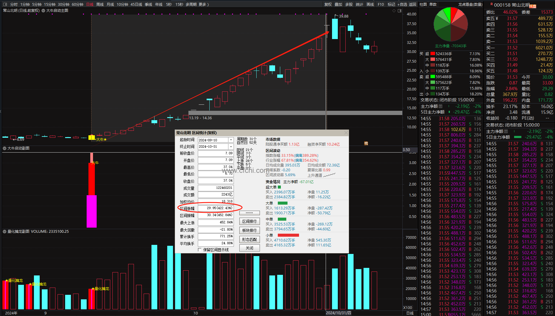 成交量激增检测:该指标通过对成交量的实时分析,当成交量比前一天大幅增加超过1.97倍时,结合其他技术条件,发出大牛捕捉信号。