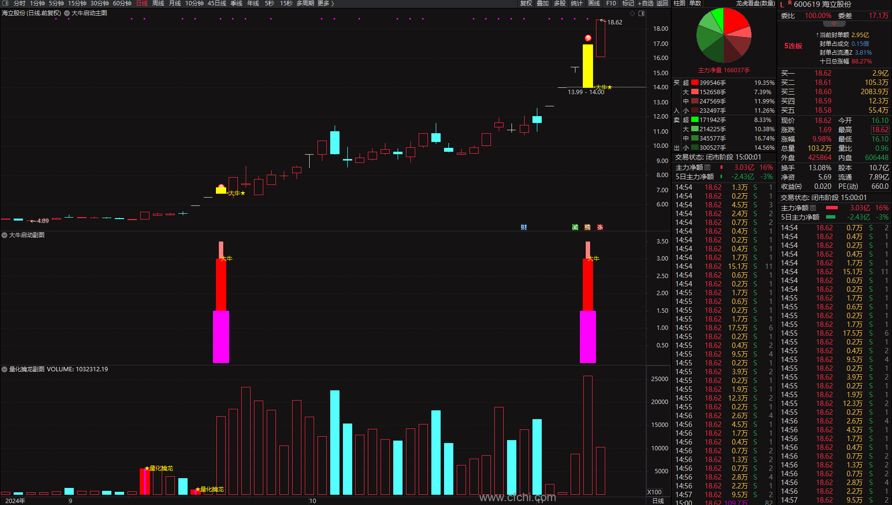 (金典通达信【大牛启动量化擒牛】1主图2副图2选股指标 爆量启动 寻找成交量极致爆发点,指标无未来)