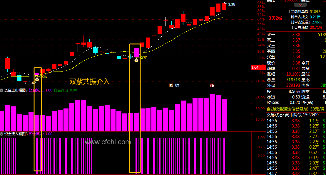 3、在第二个资金流入副图指标,则专注于显示资金的流入情况,与资金进出幅图指标中的紫柱子相呼应。