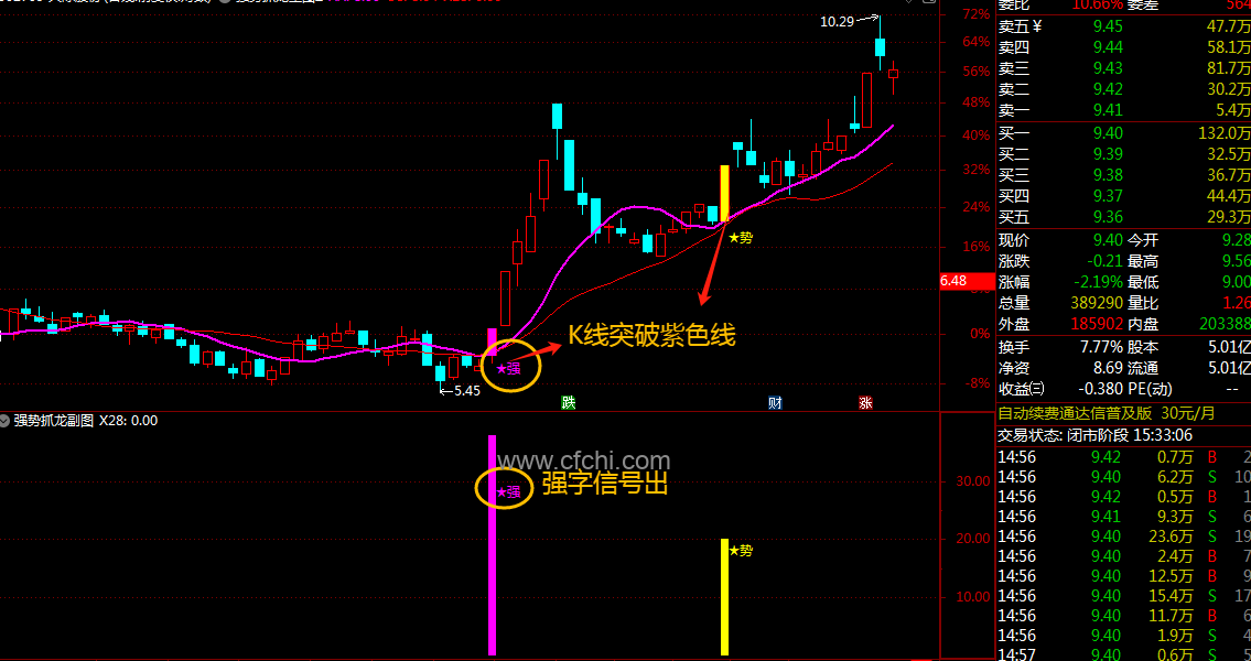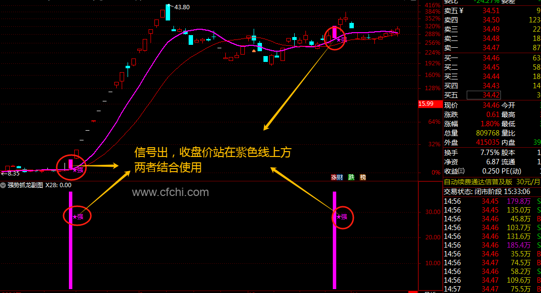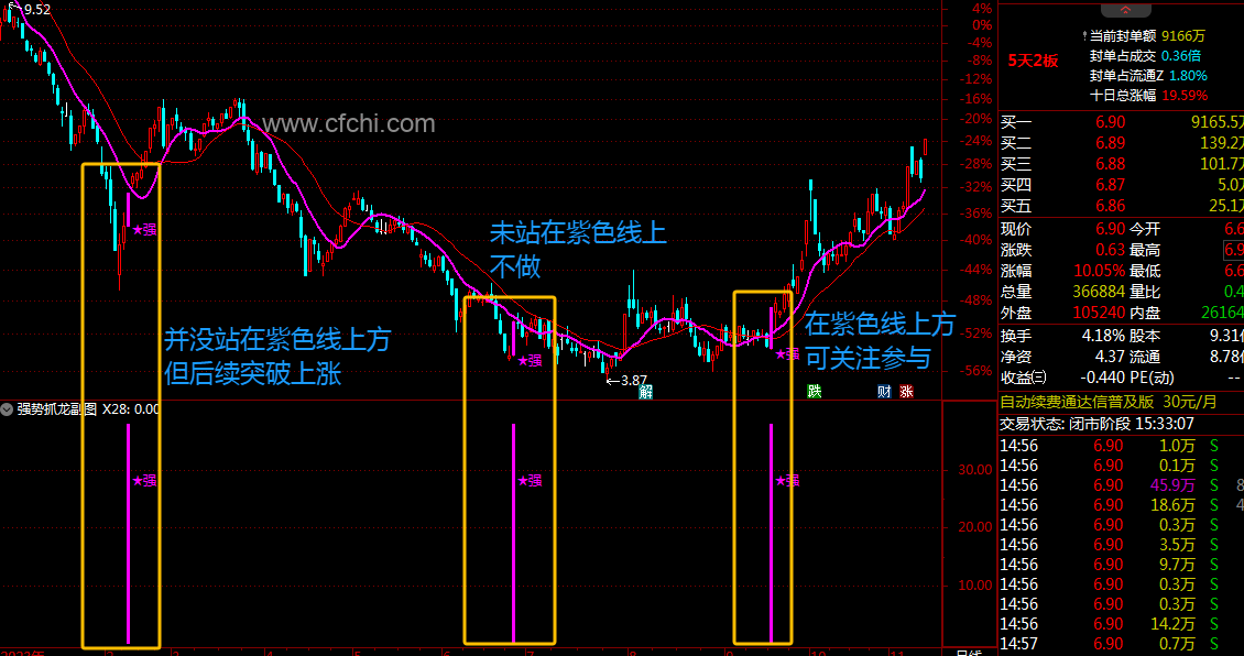 1、选股思路:当信号出现时,主图收盘价站在紫色线上或突破,前期高点后,经过长时间横盘震荡,并且震荡过程中近期上涨有持续放量,下跌缩量的个股才有关注的意义。