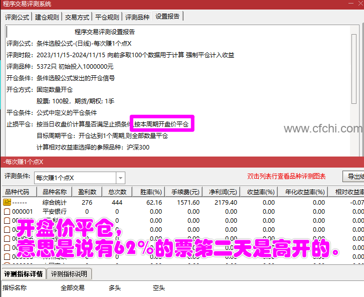 注意是每次不是每天,因为指标不是每天都会出票。指标在过去一年时间里,出票444只,其中62%的票第二天开盘直接跳空高开。93%的票第二天有冲高获利的机会。成功率相对非常高了。