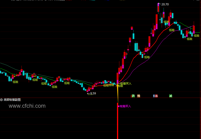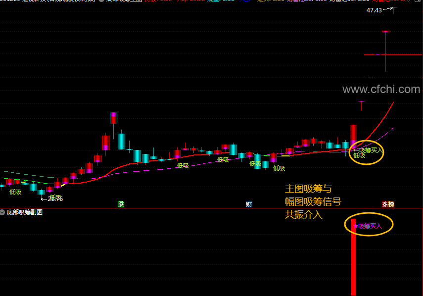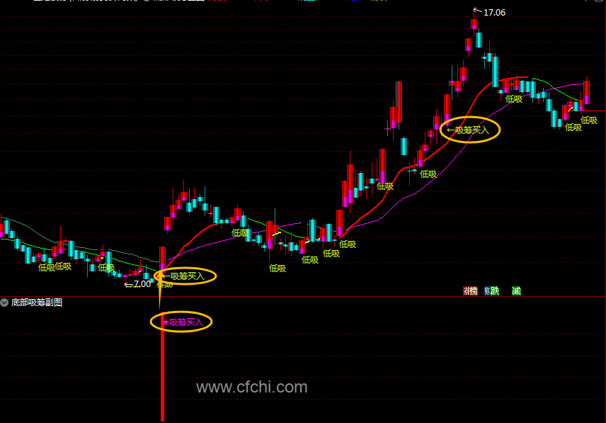 (通达信【底部吸筹买入】指标1主图1幅图1选股底部低吸吸筹买入指标不含未来函数)