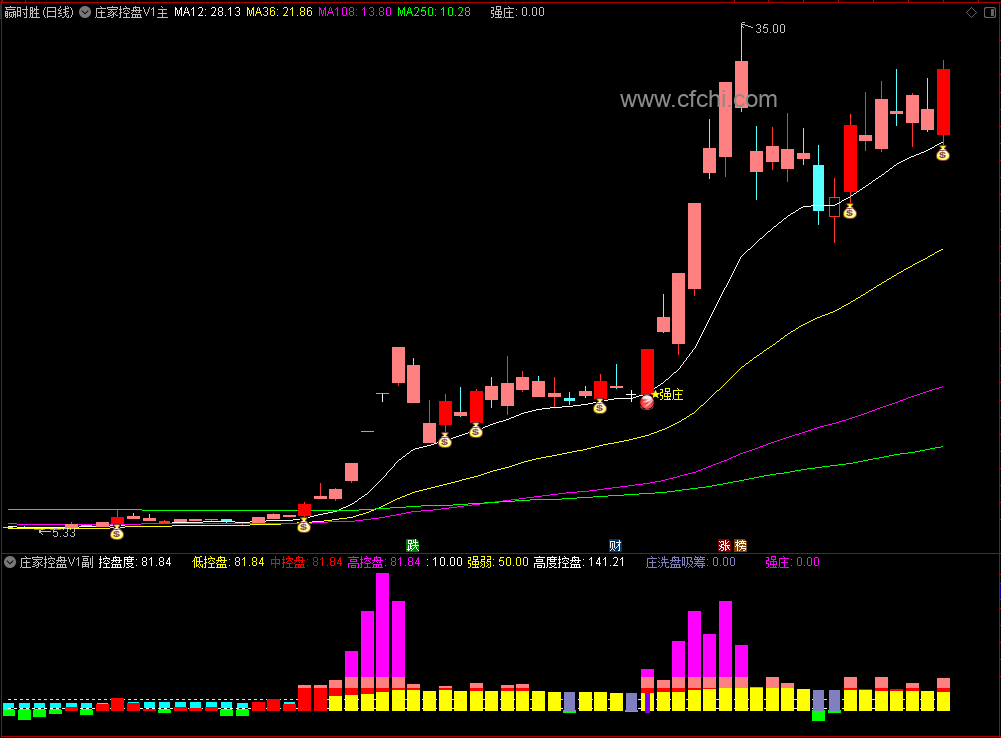 5、在幅图中,红色柱子表示庄家高度控盘,对应主图则显示为淡红色K线。当首次高度控盘站上强弱分界线时,指标将发出“钱袋子”信号,提示关注庄家的后续动作。