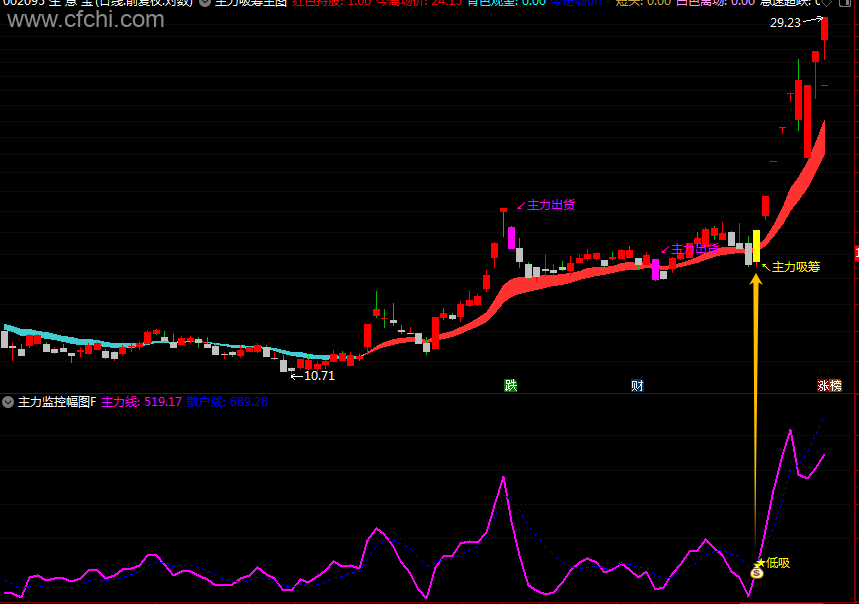 2,幅图监控主力,图中出现抄底和低吸是,这是主力前期进场建仓,等待加仓信号出时,我们在介入,