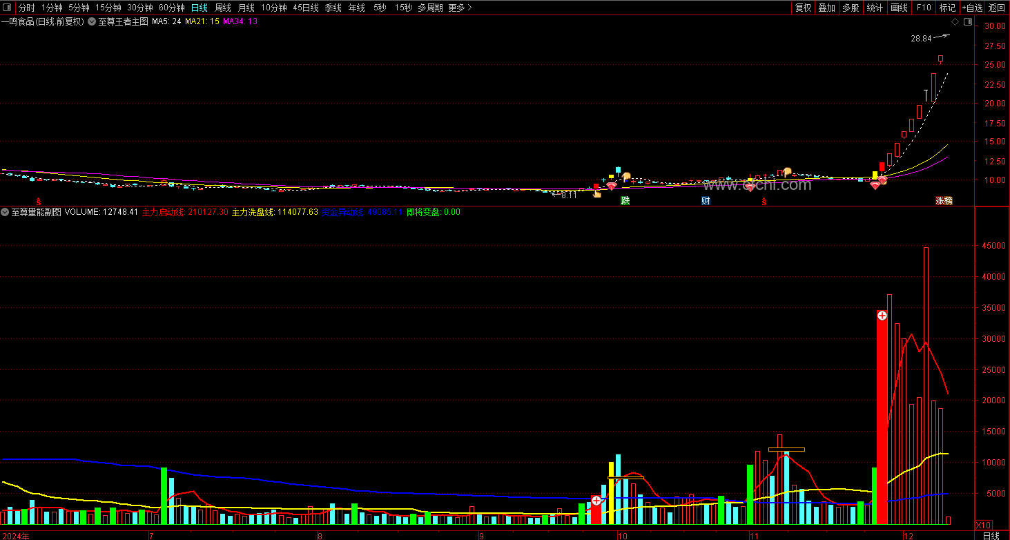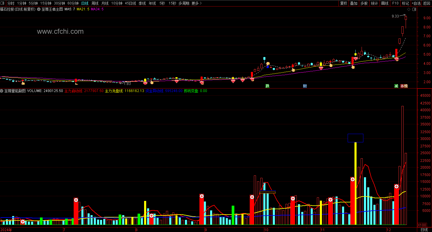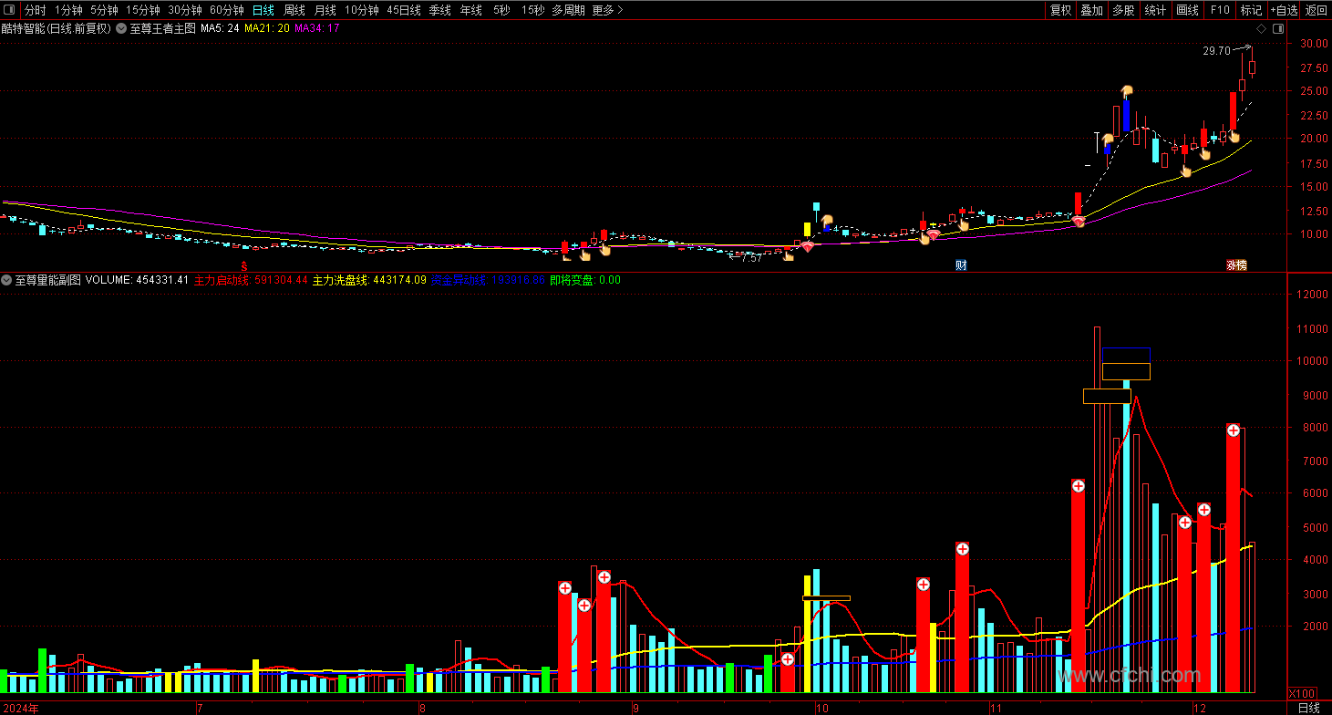 5、变盘信号:当主力启动线连续上涨,且成交量放大并上穿主力启动线时,发出绿色变盘信号,表示股价即将向上或向下变盘。
