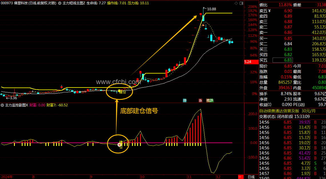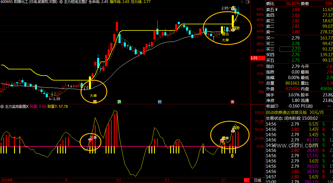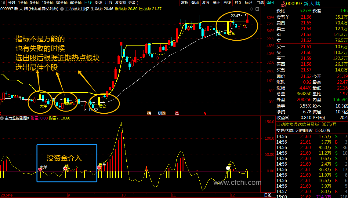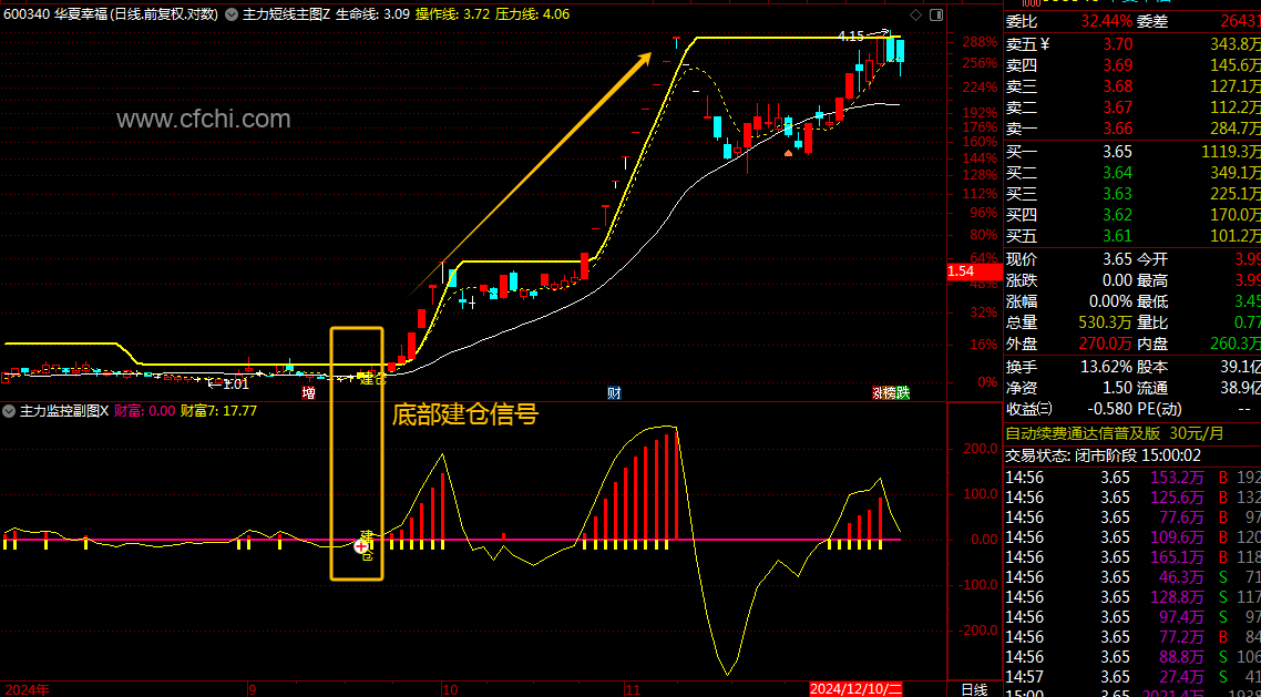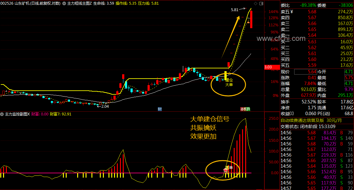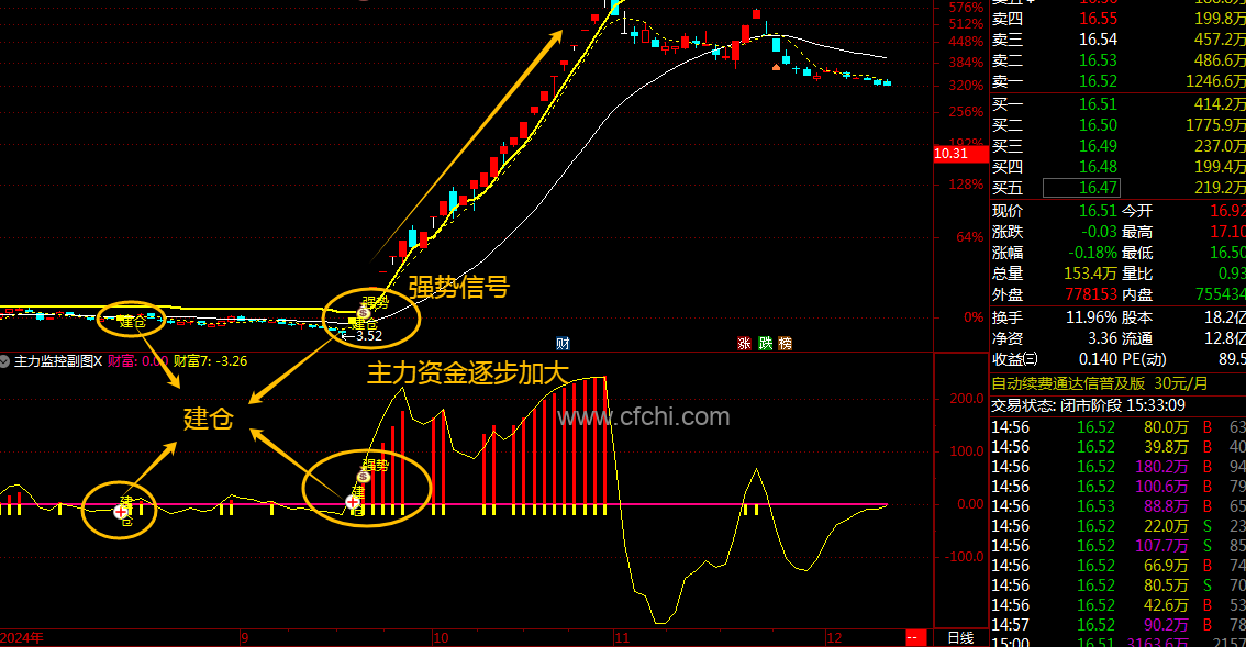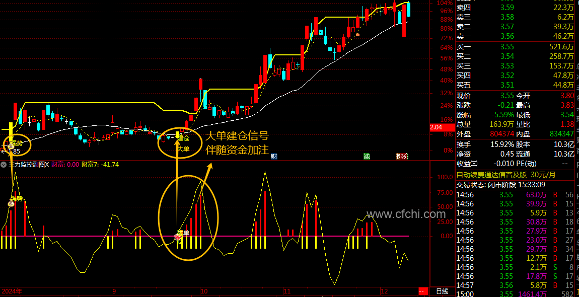 5、当综合评分达到3及以上时,建仓,大单,强势等在主图出信号,对应的副图信号,此时应重点关注,