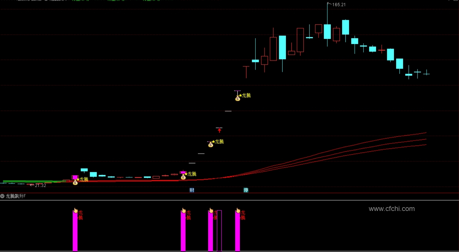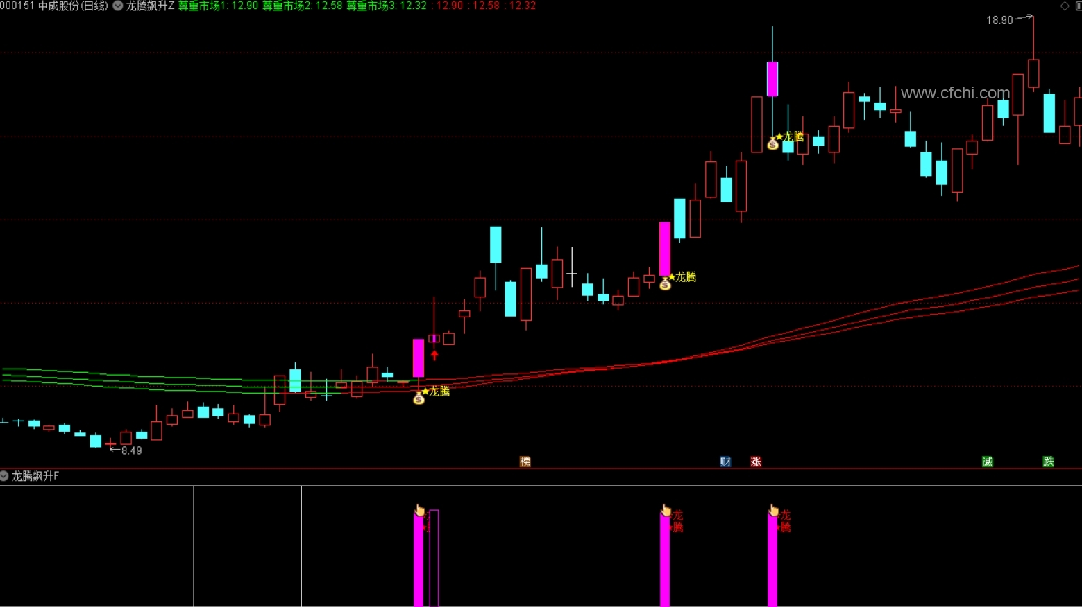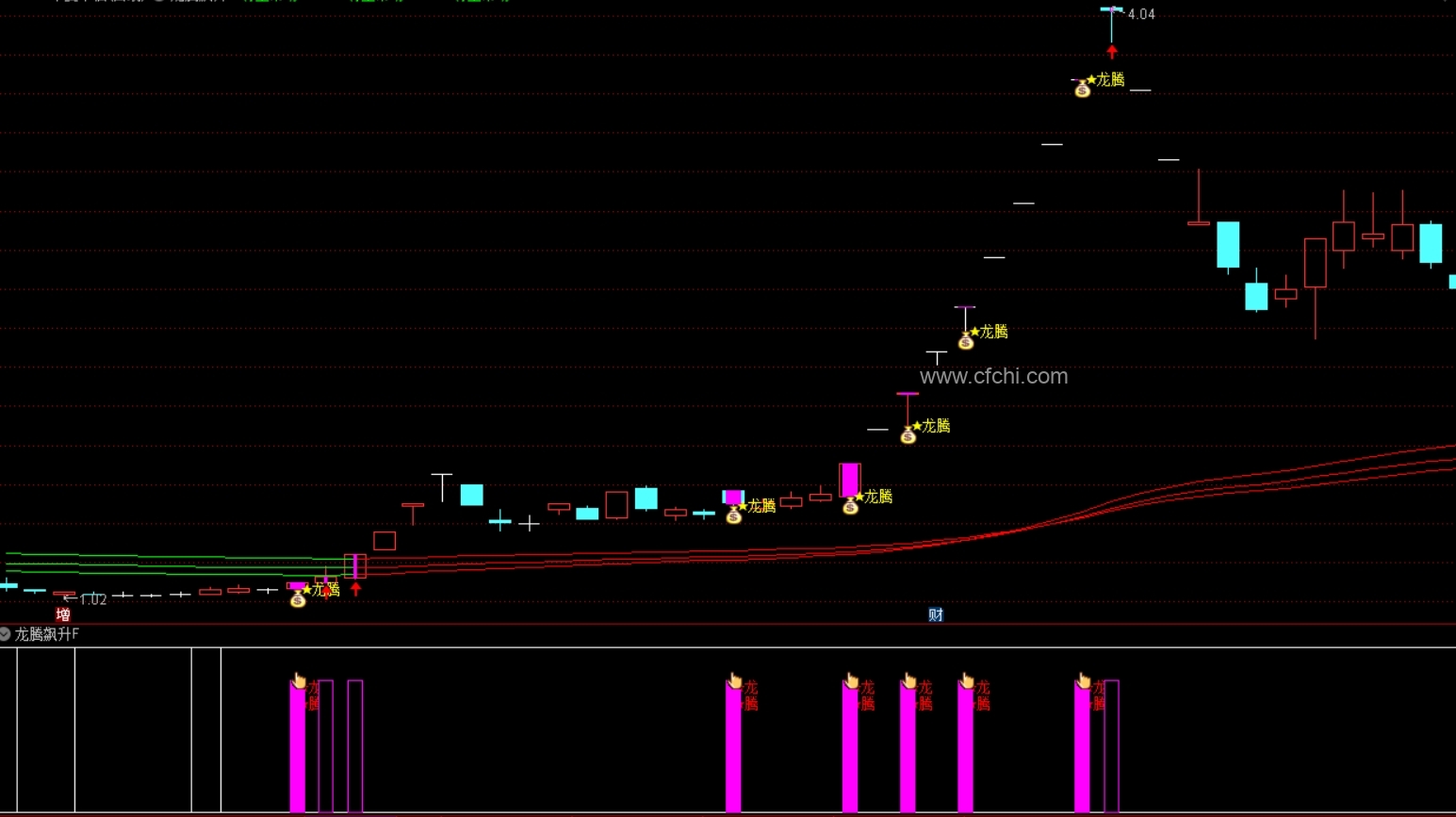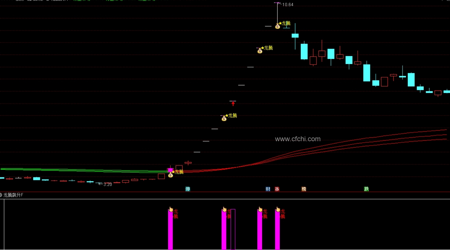 7、当所有这些条件同时满足时,认为这只个股可能是短线龙,此时会出"钱袋子-龙腾"信号。