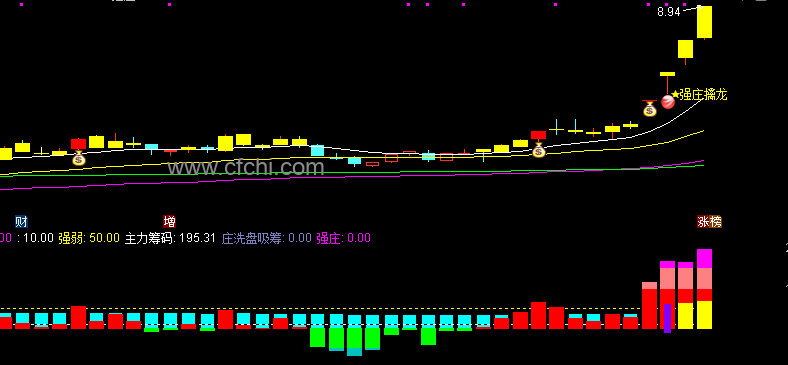 8.淡红色柱子(较强控盘):控盘力度较强:高度控盘>100,上涨趋势可能持续。