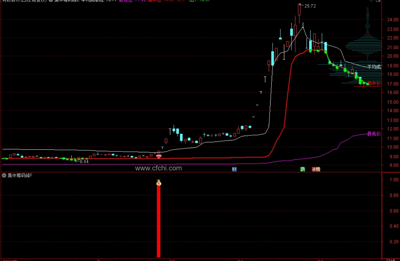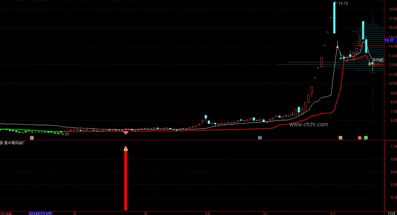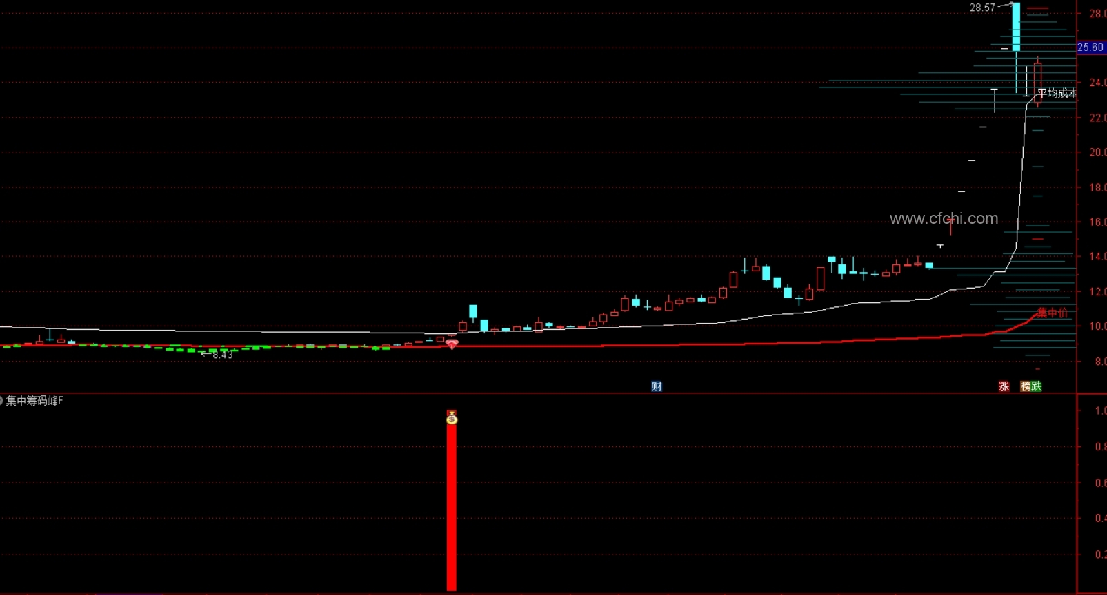 主图的最右侧坐标旁边明确标明筹码峰的平均成本、集中价位;